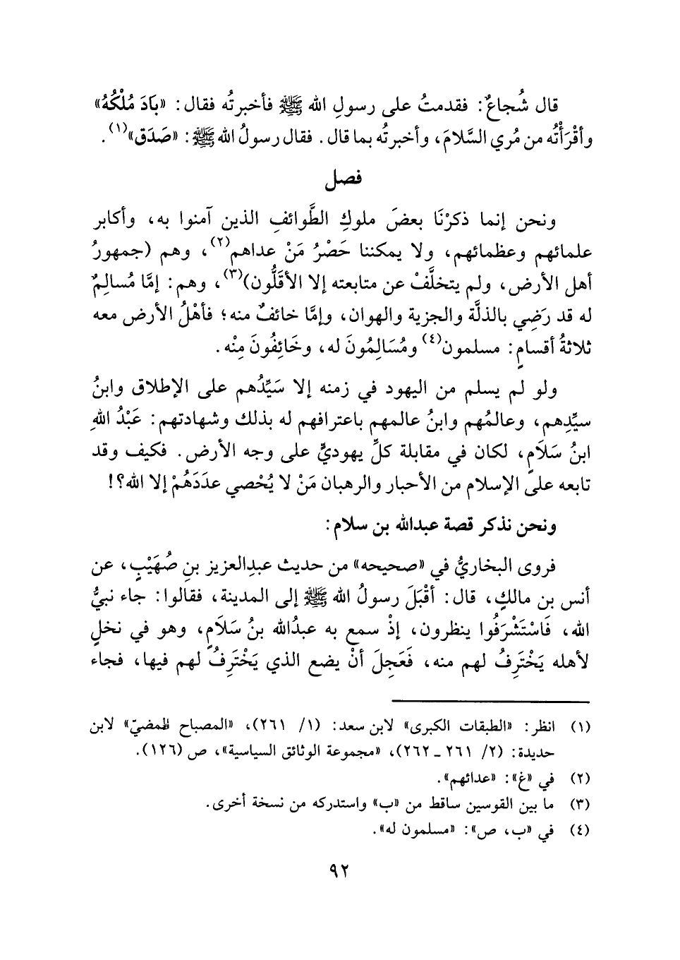 ولو لم يسلم من اليهود في زمنه إلا سَيِّدُهم على الإطلاق وابنُ سيِّدِهم، وعالمُهم وابنُ عالمهم باعترافهم له بذلك وشهادتهم: عَبْدُ اللهِ ابنُ سَلَامٍ، لكان في مقابلة كلِّ يهوديً على وجه الأرض. فكيف وقد تابعه على الإسلام من الأحبار والرهبان مَنْ لا يُحْصي عدَدَهُمْ إلا الله؟!