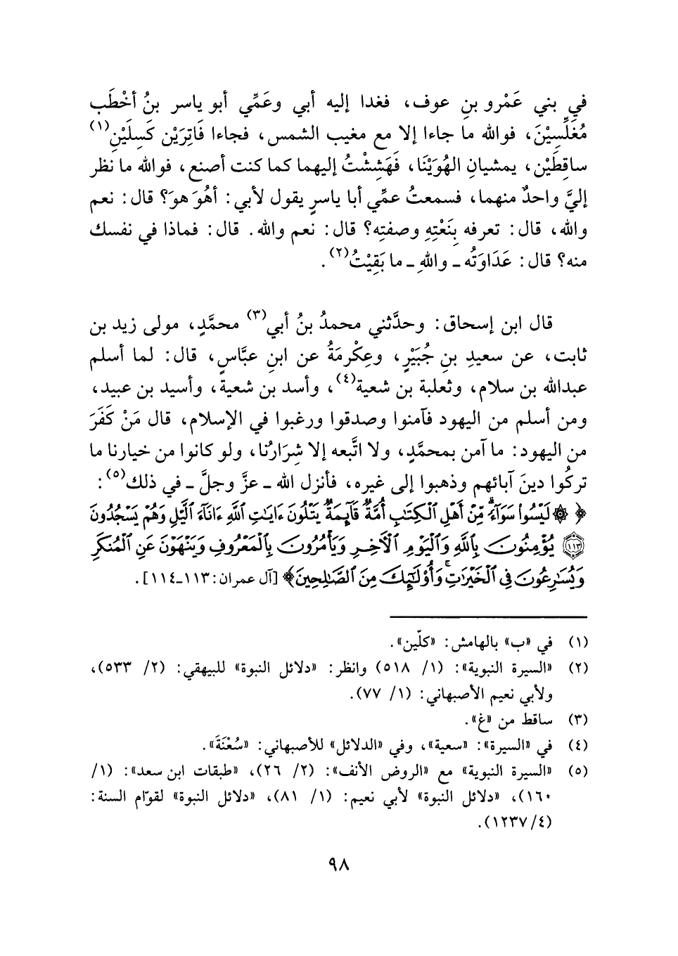 قال ابن إسحاق: وحدَّثني محمدُ بنُ أبي (¬٣) محمَّدٍ، مولى زيد بن ثابت، عن سعيدِ بنِ جُبَيْرٍ، وعِكْرمَةُ عن ابنِ عبَّاسٍ، قال: لما أسلم عبد الله بن سلام، وثعلبة بن شعية (¬٤) ، وأسد بن شعية، وأسيد بن عبيد، ومن أسلم من اليهود فآمنوا وصدقوا ورغبوا في الإسلام، قال مَنْ كَفَرَ من اليهود: ما آمن بمحمَّدٍ، ولا اتَّبعه إلا شِرَارُنا، ولو كانوا من خيارنا ما تركُوا دينَ آبائهم وذهبوا إلى غيره، فأنزل الله -عزَّ وجلَّ- في ذلك (¬٥) : {لَيْسُوا سَوَاءً مِنْ أَهْلِ الْكِتَابِ أُمَّةٌ قَائِمَةٌ يَتْلُونَ آيَاتِ اللَّهِ آنَاءَ اللَّيْلِ وَهُمْ يَسْجُدُونَ (١١٣) يُؤْمِنُونَ بِاللَّهِ وَالْيَوْمِ الْآخِرِ وَيَأْمُرُونَ بِالْمَعْرُوفِ وَيَنْهَوْنَ عَنِ الْمُنْكَرِ وَيُسَارِعُونَ فِي الْخَيْرَاتِ وَأُولَئِكَ مِنَ الصَّالِحِينَ} [آل عمران: ١١٣، ١١٤].