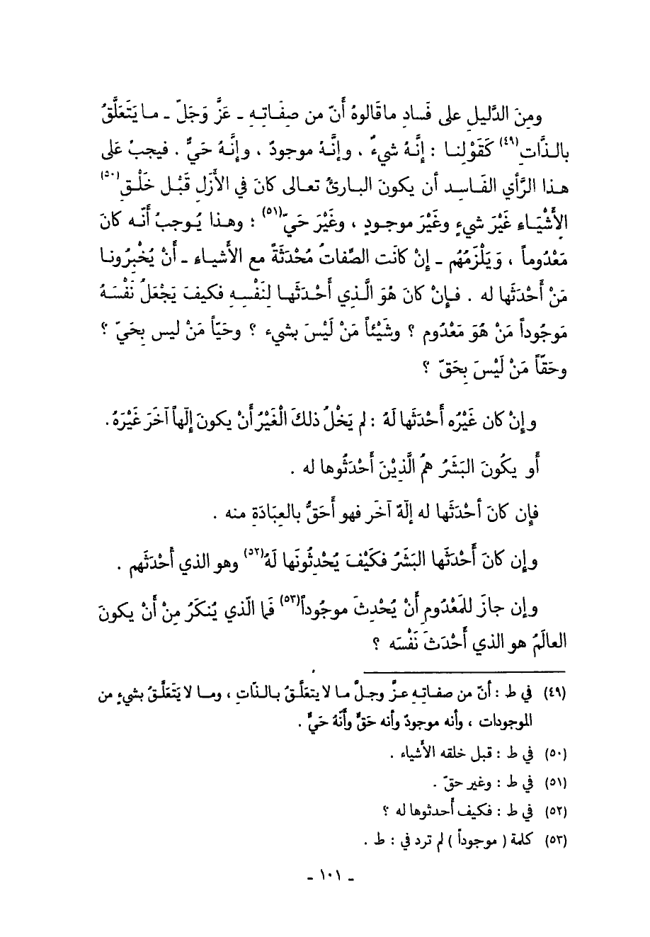 وَمن الدَّلِيل على فَسَاد مَا قَالُوهُ أَن من صِفَاته عز وَجل مَا يتَعَلَّق بِالذَّاتِ كَقَوْلِنَا إِنَّه شَيْء وَإنَّهُ مَوْجُود وَإنَّهُ حَيّ فَيجب على هَذَا الرَّأْي الْفَاسِد أَن يكون البارئ تَعَالَى كَانَ فِي الْأَزَل قبل خلق الْأَشْيَاء غير شَيْء وَغير مَوْجُود وَغير حَيّ وَهَذَا يُوجب أَنه كَانَ مَعْدُوما ويلزمهم إِن كَانَت الصِّفَات محدثة مَعَ الْأَشْيَاء أَن يخبرونا من أحدثها لَهُ فَإِن كَانَ هُوَ الَّذِي أحدثها لنَفسِهِ فَكيف يَجْعَل نَفسه مَوْجُودا من هُوَ مَعْدُوم وشيئا من لَيْسَ بِشَيْء وَحيا من لَيْسَ بحي وَحقا من لَيْسَ بِحَق