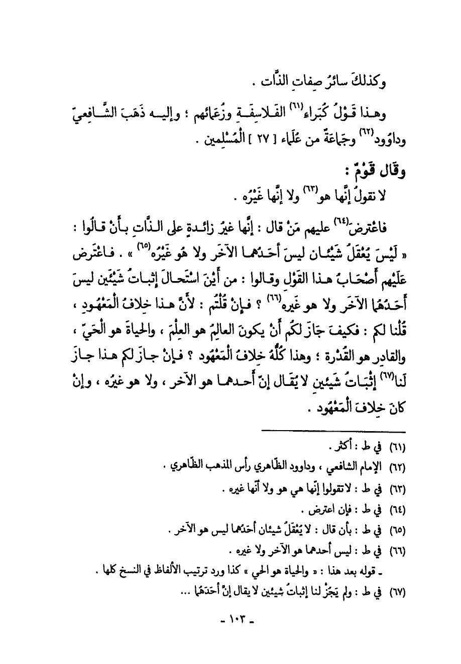 فَاعْترضَ عَلَيْهِم من قَالَ إِنَّهَا غير زَائِدَة على الذَّات بِأَن قَالُوا لَيْسَ يعقل شَيْئَانِ لَيْسَ أَحدهمَا الآخر وَلَا هُوَ غَيره فَاعْترضَ عَلَيْهِم أَصْحَاب هَذَا القَوْل وَقَالُوا من أَيْن اسْتَحَالَ إِثْبَات شَيْئَيْنِ لَيْسَ أَحدهمَا الآخر وَلَا هُوَ غَيره فَإِن قُلْتُمْ لِأَن هَذَا خلاف الْمَعْهُود قُلْنَا لكم فَكيف جَازَ لكم أَن يكون الْعَالم هُوَ الْعلم والحياة هُوَ الْحَيّ والقادر هُوَ الْقُدْرَة وَهَذَا كُله خلاف الْمَعْهُود فَإِن جَازَ لكم هَذَا جَازَ لنا إِثْبَات شَيْئَيْنِ لَا يُقَال إِن أَحدهمَا هُوَ الآخر وَلَا هُوَ غَيره وَإِن كَانَ خلاف الْمَعْهُود