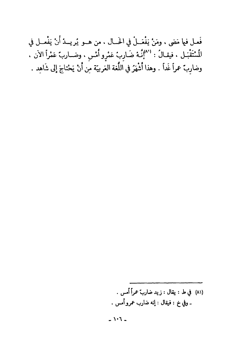 فعل فِيمَا مضى وَمن يفعل فِي الْحَال من هُوَ يُرِيد أَن يفعل فِي الْمُسْتَقْبل فَيُقَال إِنَّه ضَارب عَمْرو أمس وضارب عمرا الْآن وضارب عمرا غَدا وَهَذَا أشهر فِي اللُّغَة الْعَرَبيَّة من أَن يحْتَاج إِلَى شَاهد