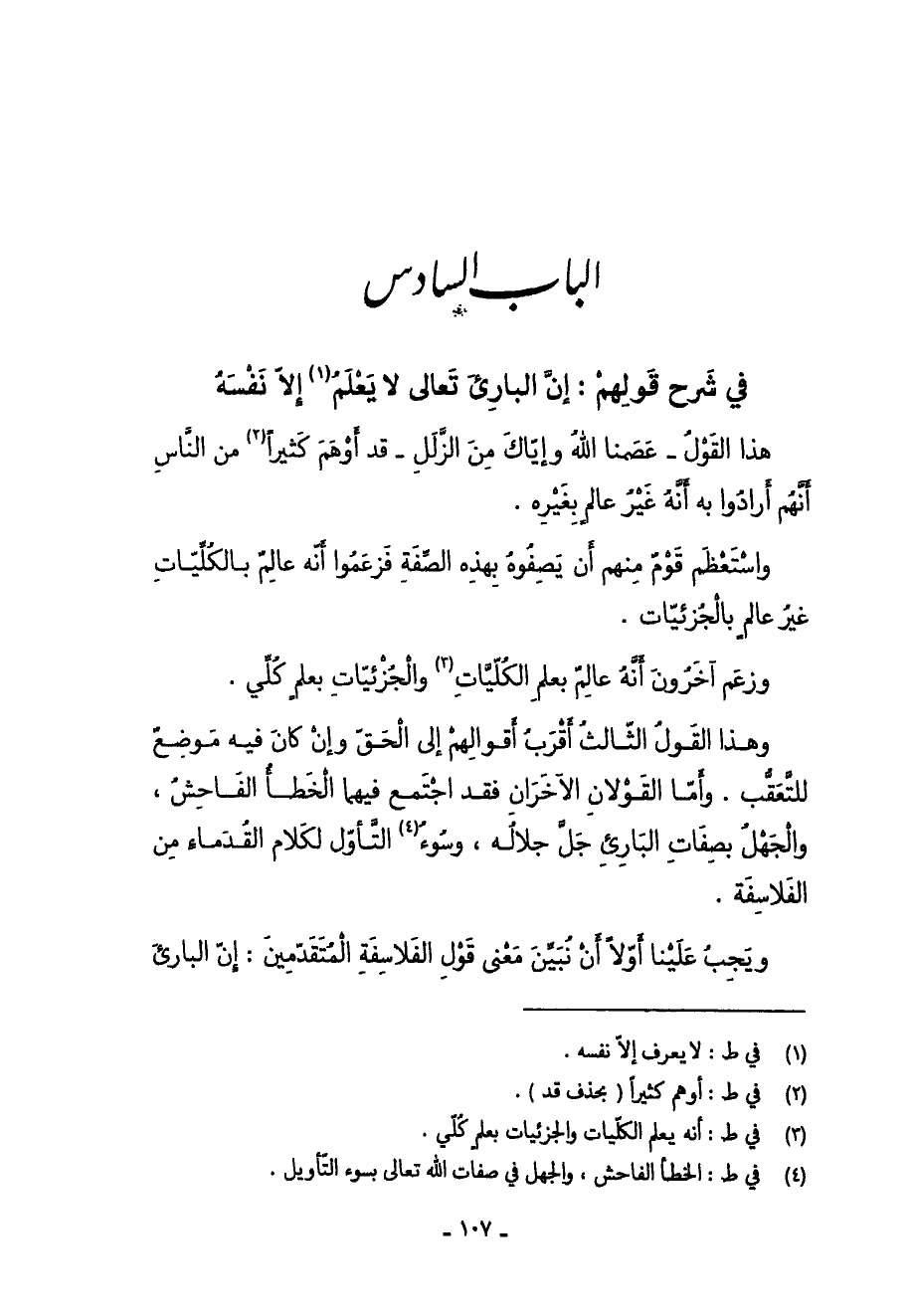 الْبَاب السَّادِس فِي شرح قَوْلهم إِن البارئ تَعَالَى لَا يعلم إِلَّا نَفسه
