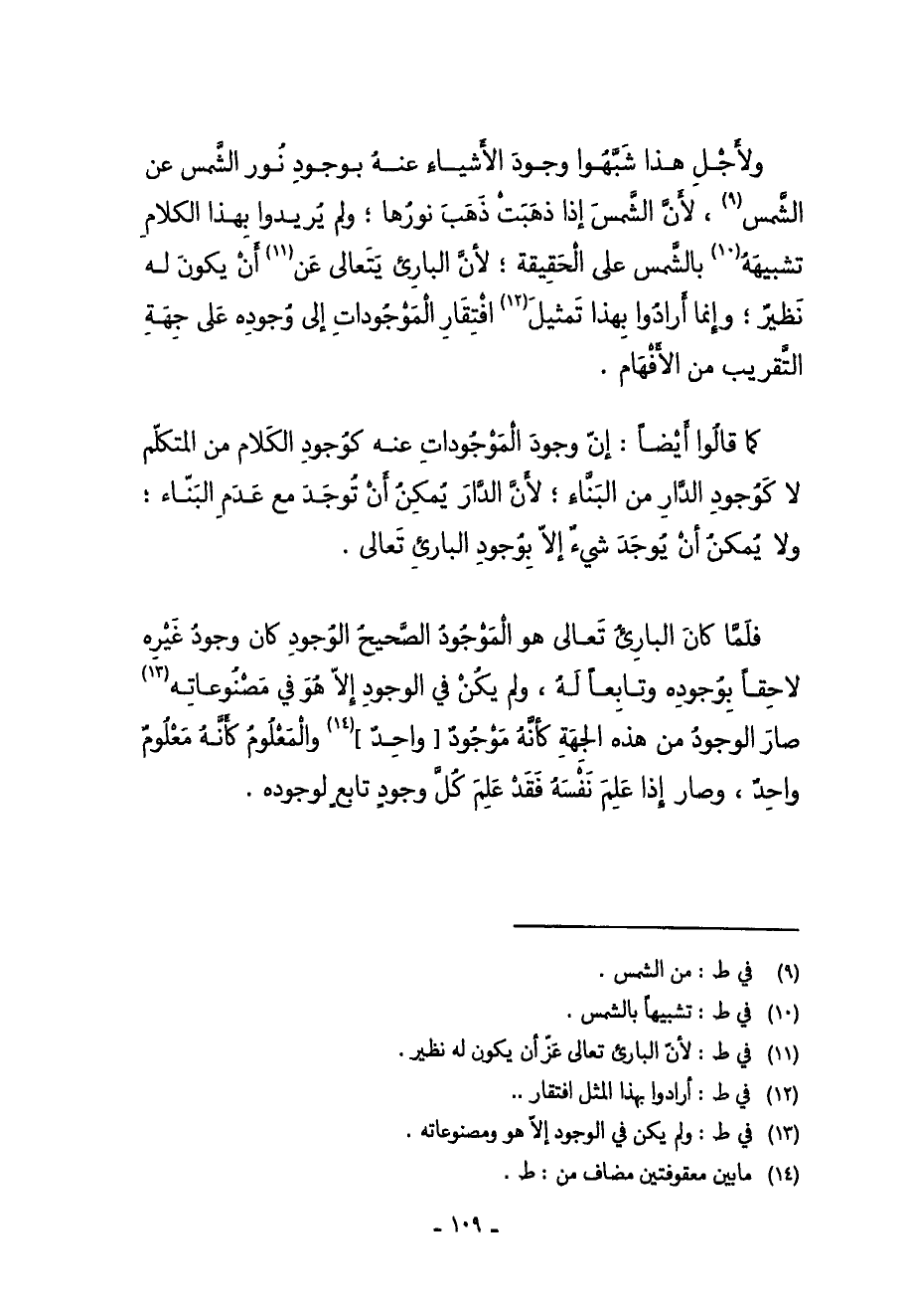 وَلأَجل هَذَا شبهوا وجود الْأَشْيَاء عَنهُ بِوُجُود نور الشَّمْس عَن الشَّمْس لِأَن الشَّمْس إِذا ذهبت ذهب نورها وَلم يُرِيدُوا بِهَذَا الْكَلَام تشبيهه بالشمس على الْحَقِيقَة لِأَن البارئ يتعالى عَن أَن يكون لَهُ نَظِير وَإِنَّمَا أَرَادوا بِهَذَا تَمْثِيل افتقار الموجودات إِلَى وجوده على جِهَة التَّقْرِيب من الأفهام