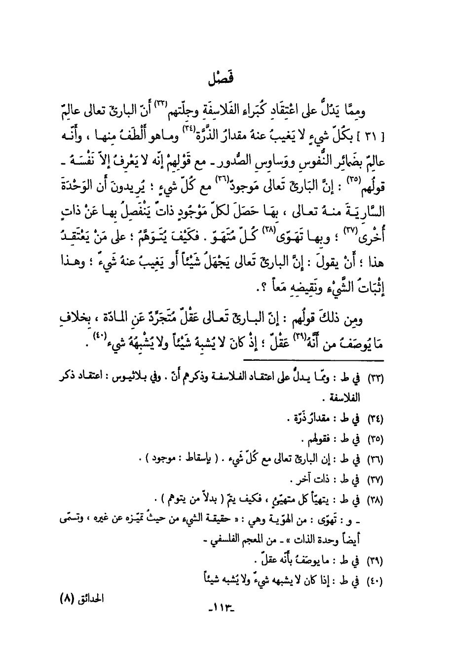 وَمِمَّا يدل على اعْتِقَاد كبراء الفلاسفة وجلتهم أَن البارئ تَعَالَى عَالم بِكُل شَيْء لَا يغيب عَنهُ مِقْدَار الذّرة وَمَا هُوَ ألطف مِنْهَا وَأَنه عَالم بضمائر النُّفُوس ووساوس الصُّدُور مَعَ قَوْلهم إِنَّه لَا يعرف إِلَّا نَفسه قَوْلهم إِن البارئ تَعَالَى مَوْجُود مَعَ كل شَيْء يُرِيدُونَ أَن الْوحدَة السارية مِنْهُ تَعَالَى بهَا حصل لكل مَوْجُود ذَات ينْفَصل بهَا عَن ذَات أُخْرَى وَبهَا تهوى كل متهو فَكيف يتَوَهَّم على من يعْتَقد هَذَا أَن يَقُول إِن البارئ تَعَالَى يجهل شَيْئا أَو يغيب عَنهُ شَيْء وَهَذَا إِثْبَات الشَّيْء ونقيضه مَعًا