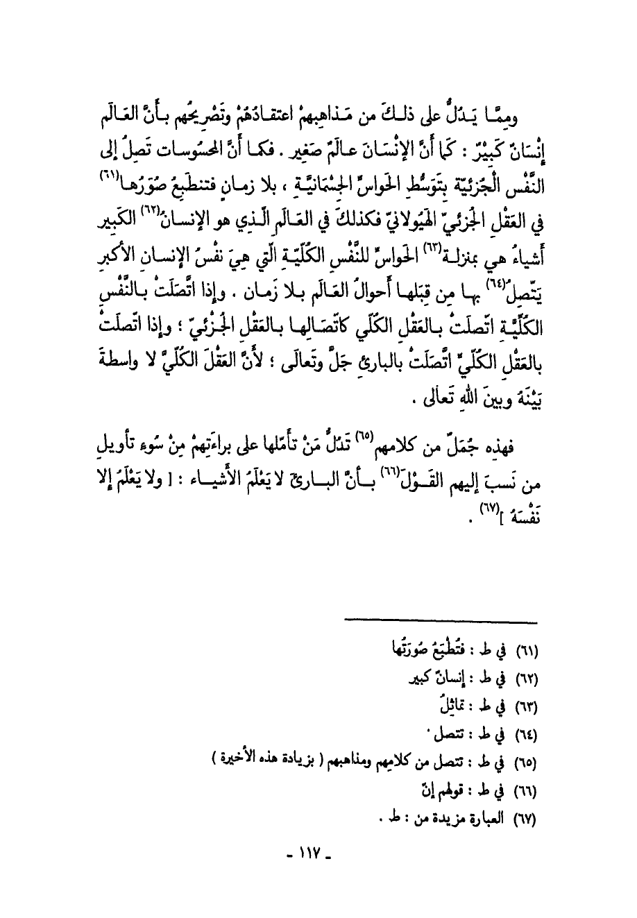 وَمِمَّا يدل على ذَلِك من مذاهبهم اعْتِقَادهم وتصريحهم بِأَن الْعَالم إِنْسَان كَبِير كَمَا أَن الْإِنْسَان عَالم صَغِير فَكَمَا أَن المحسوسات تصل إِلَى النَّفس الْجُزْئِيَّة بتوسط الْحَواس الجسمانية بلازمان فتنطبع صورها فِي الْعقل الجزئي الهيولاني فَكَذَلِك فِي الْعَالم الَّذِي هُوَ الْإِنْسَان الْكَبِير أَشْيَاء هِيَ بِمَنْزِلَة الْحَواس للنَّفس الْكُلية الَّتِي هِيَ نفس الْإِنْسَان الْأَكْبَر يتَّصل بهَا من قبلهَا أَحْوَال الْعَالم بِلَا زمَان وَإِذا اتَّصَلت بِالنَّفسِ الْكُلية اتَّصَلت بِالْعقلِ الْكُلِّي كاتصالها بِالْعقلِ الجزئي وَإِذا اتَّصَلت بِالْعقلِ الْكُلِّي اتَّصَلت بالبارئ جلّ وَتَعَالَى لِأَن الْعقل الْكُلِّي لَا وَاسِطَة بَينه وَبَين الله تَعَالَى