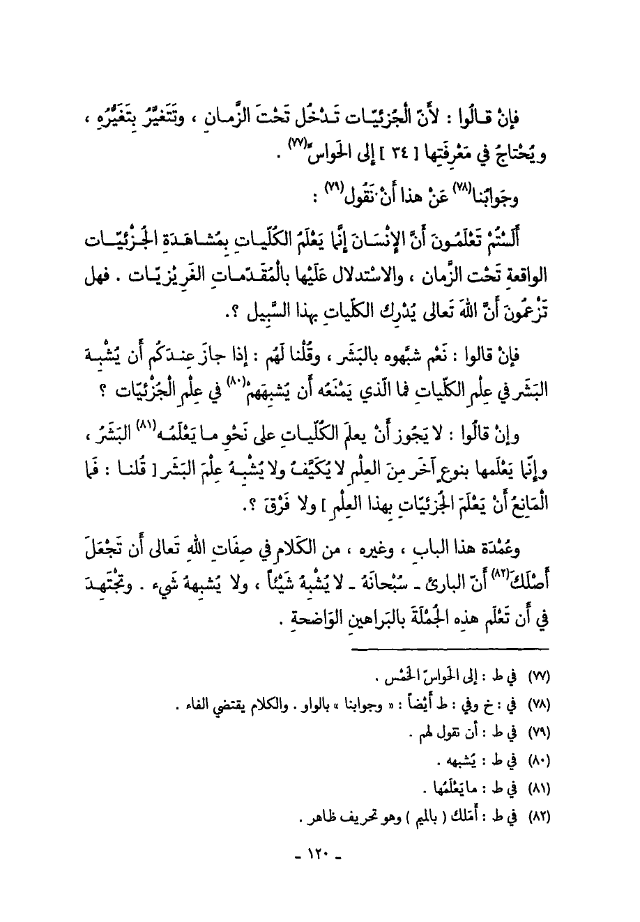 ألستم تعلمُونَ أَن الْإِنْسَان إِنَّمَا يعلم الكليات بمشاهدة الجزئيات الْوَاقِعَة تَحت الزَّمَان وَالِاسْتِدْلَال عَلَيْهَا بالمقدمات الغريزيات فَهَل تَزْعُمُونَ أَن الله تَعَالَى يدْرك الكليات بِهَذَا السَّبِيل