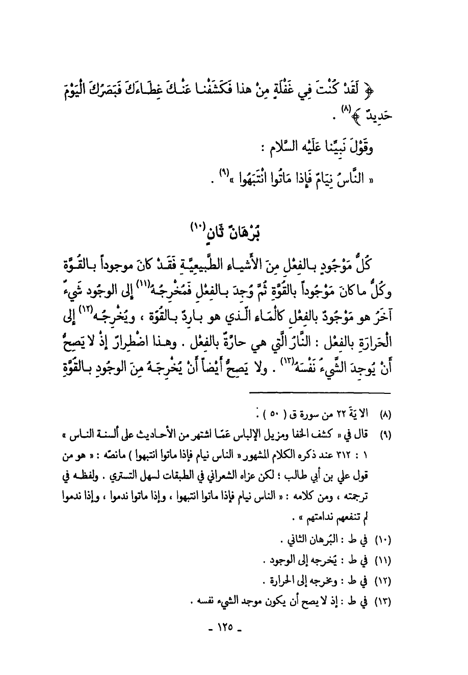 كل مَوْجُود بِالْفِعْلِ من الْأَشْيَاء الطبيعية فقد كَانَ مَوْجُودا بِالْقُوَّةِ وكل مَا كَانَ مَوْجُودا بِالْقُوَّةِ ثمَّ وجد بِالْفِعْلِ فمخرجه إِلَى الْوُجُود شَيْء آخر هُوَ مَوْجُود بِالْفِعْلِ كَالْمَاءِ الَّذِي هُوَ بَارِد بِالْقُوَّةِ ويخرجه إِلَى الْحَرَارَة بِالْفِعْلِ النَّار الَّتِي هِيَ حارة بِالْفِعْلِ وَهَذَا اضطرار إِذْ لَا يَصح أَن يُوجد الشَّيْء نَفسه وَلَا يَصح أَيْضا أَن يُخرجهُ من الْوُجُود بِالْقُوَّةِ