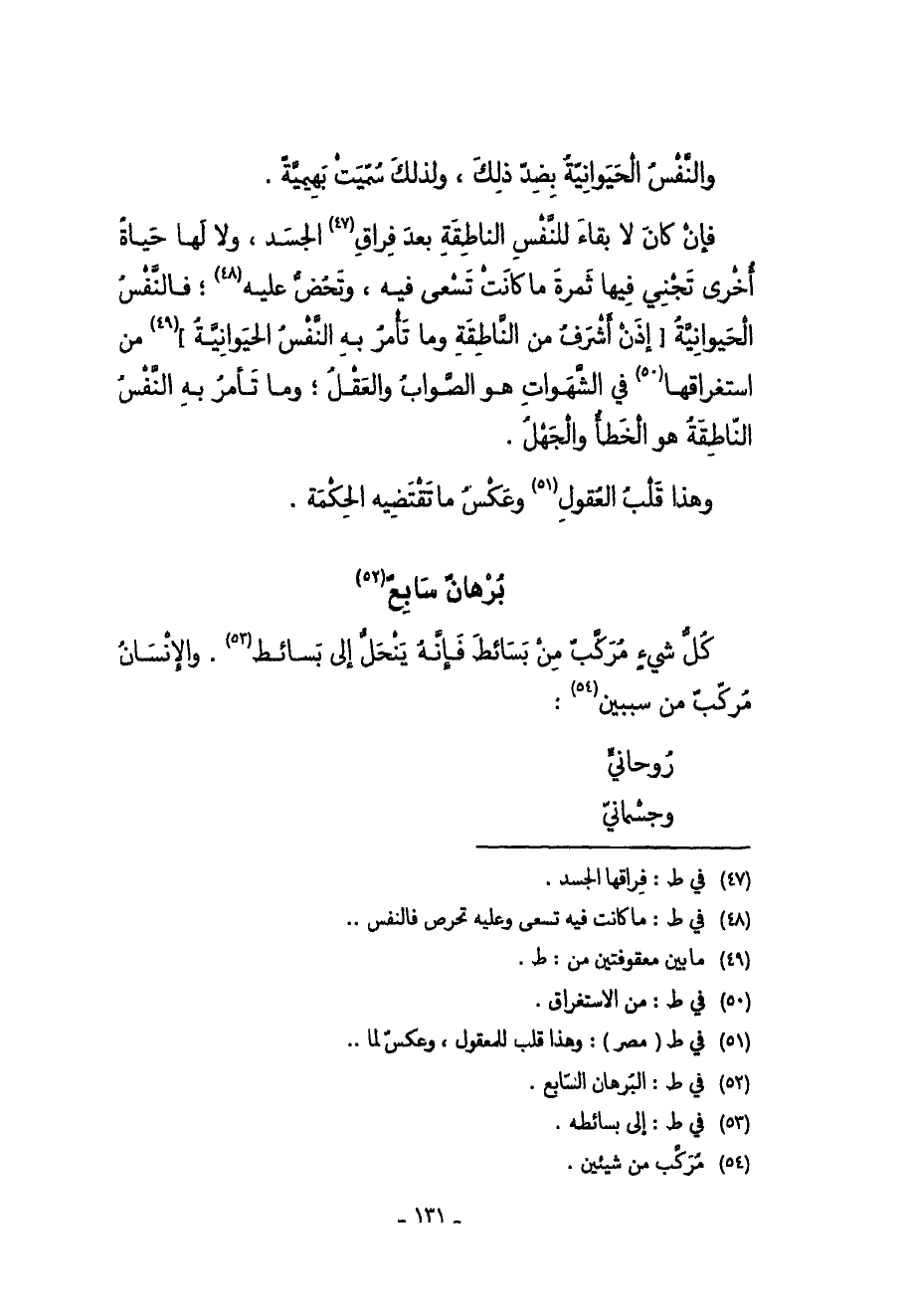 فَإِن كَانَ لَا بَقَاء للنَّفس الناطقة بعد فِرَاق الْجَسَد وَلَا لَهَا حَيَاة أُخْرَى تجني فِيهَا ثَمَرَة مَا كَانَت تسْعَى فِيهِ وتحض عَلَيْهِ فَالنَّفْس الحيوانية إِذن أشرف من الناطقة وَمَا تَأمر بِهِ النَّفس الحيوانية من استغراقها فِي الشَّهَوَات هُوَ الصَّوَاب وَالْعقل وَمَا تَأمر بِهِ النَّفس الناطقة هُوَ الْخَطَأ وَالْجهل