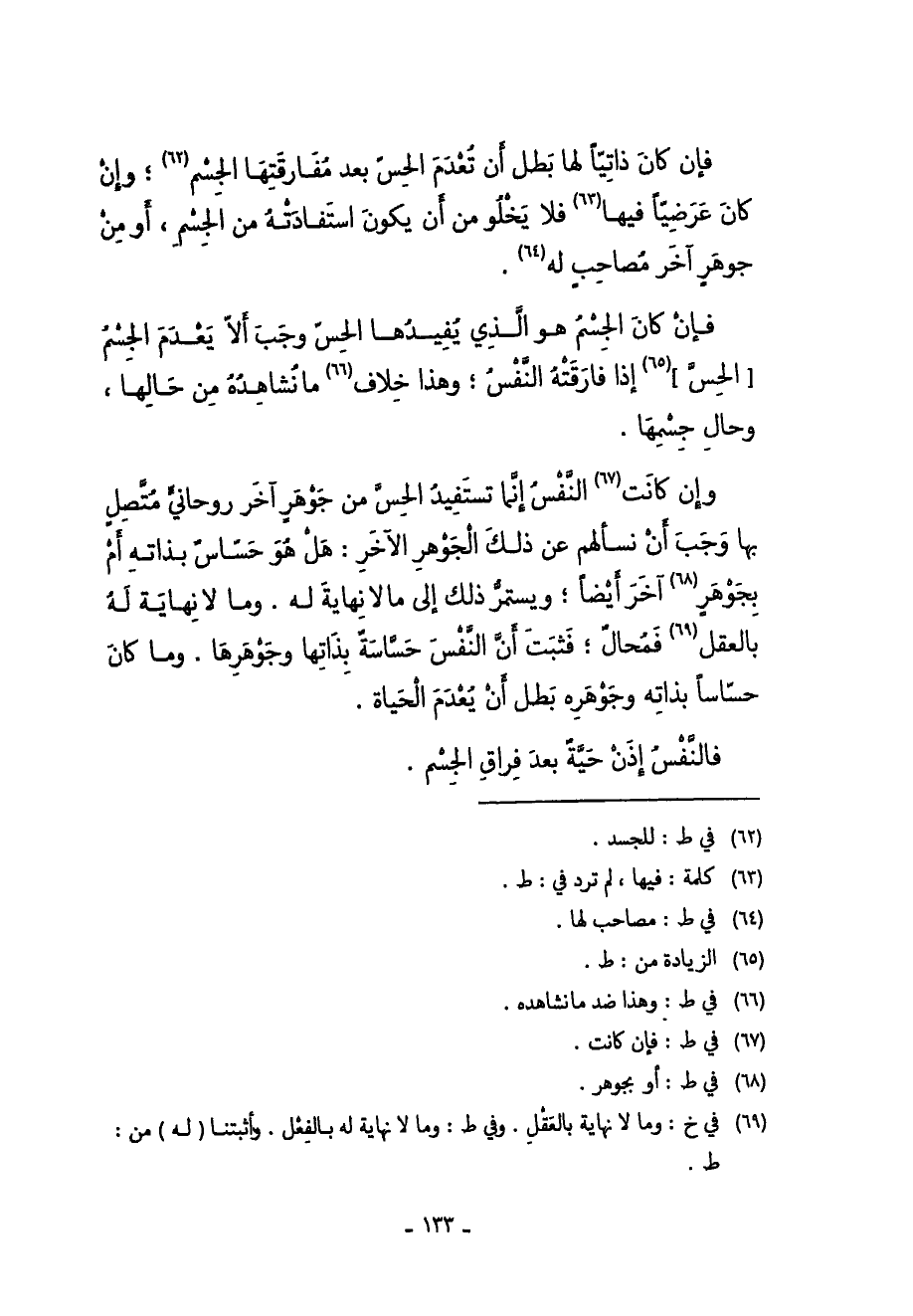 وَإِن كَانَت النَّفس إِنَّمَا تستفيد الْحس من جَوْهَر آخر روحاني مُتَّصِل بهَا وَجب أَن نسألهم عَن ذَلِك الْجَوْهَر الآخر هَل هُوَ حساس بِذَاتِهِ أم بجوهر آخر أَيْضا وَيسْتَمر ذَلِك إِلَى مَالا نِهَايَة لَهُ وَمَا لَا نِهَايَة لَهُ بِالْعقلِ فمحال فَثَبت أَن النَّفس حساسة بذاتها وجوهرها وَمَا كَانَ حساسا بِذَاتِهِ وجوهره بَطل أَن يعْدم الْحَيَاة
