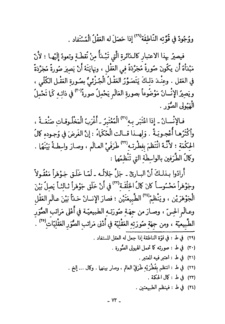 فَيصير بِهَذَا الِاعْتِبَار كالدائرة الَّتِي تبدأ من نقطة وتعود إِلَيْهَا لِأَن مبدأه أَن يكون صُورَة مُجَرّدَة فِي الْعقل ونهايته أَن يصير صُورَة مُجَرّدَة فِي الْعقل وَعند ذَلِك يتَصَوَّر الْعقل الجزئي بِصُورَة الْعقل الْكُلِّي وَيصير الْإِنْسَان مَوْضُوعا بِصُورَة الْعَالم يحمل صُورَة فِي ذَاته كَمَا تحمل الهيولى الصُّور