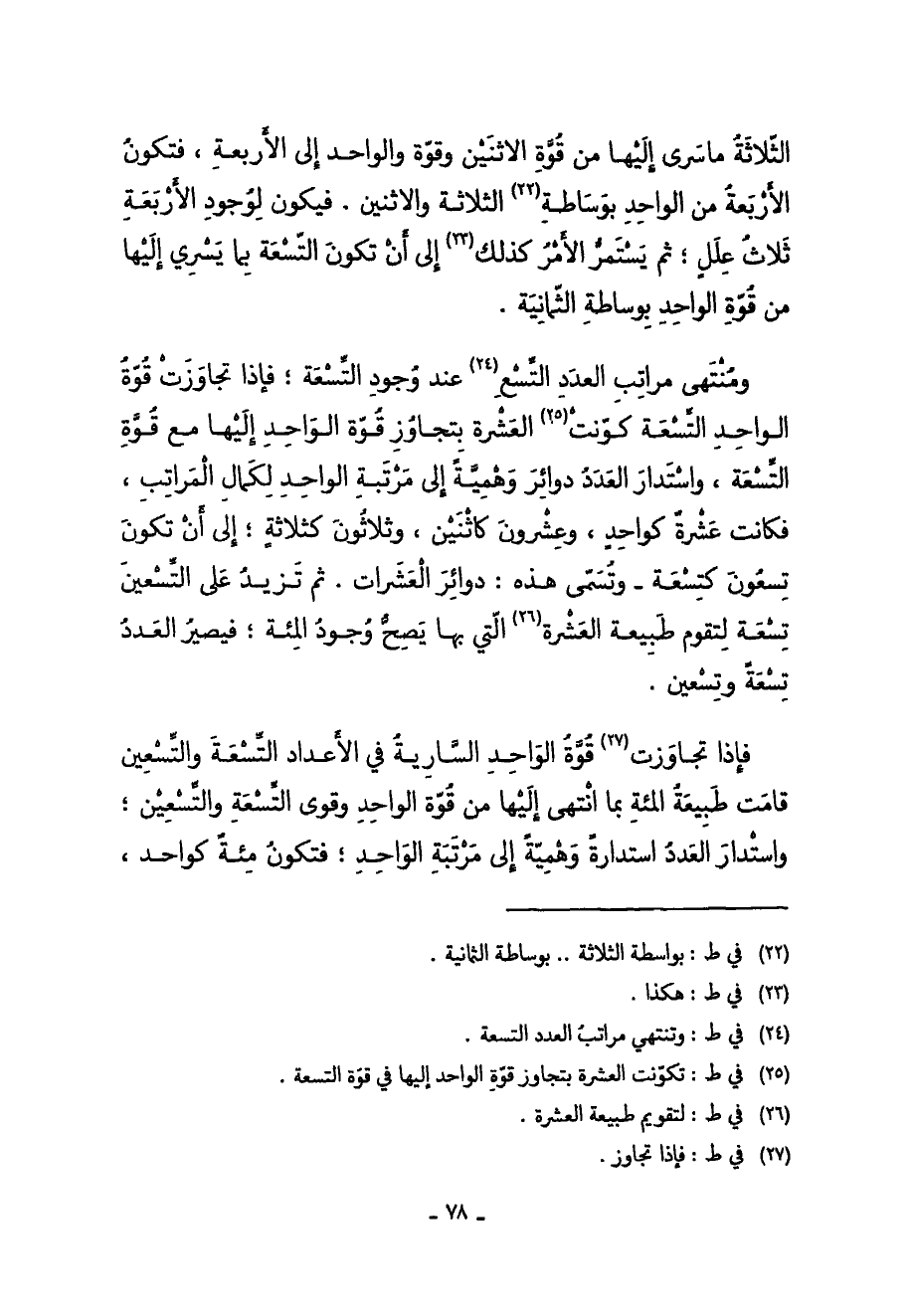 ومنتهى مَرَاتِب الْعدَد التسع عِنْد وجود التِّسْعَة فَإِذا تجاوزت قُوَّة الْوَاحِد التِّسْعَة كونت الْعشْرَة بتجاوز قُوَّة الْوَاحِد إِلَيْهَا مَعَ قُوَّة التِّسْعَة واستدار الْعدَد دوائر وهمية إِلَى مرتبَة الْوَاحِد لكَمَال الْمَرَاتِب فَكَانَت عشرَة كواحد وَعِشْرُونَ كاثنين وَثَلَاثُونَ كثلاثة إِلَى أَن تكون تسعون كتسعة وَتسَمى هَذِه دوائر العشرات ثمَّ تزيد على التسعين تِسْعَة لتقوم طبيعة الْعشْرَة الَّتِي بهَا يَصح وجود المئة فَيصير الْعدَد تِسْعَة وَتِسْعين