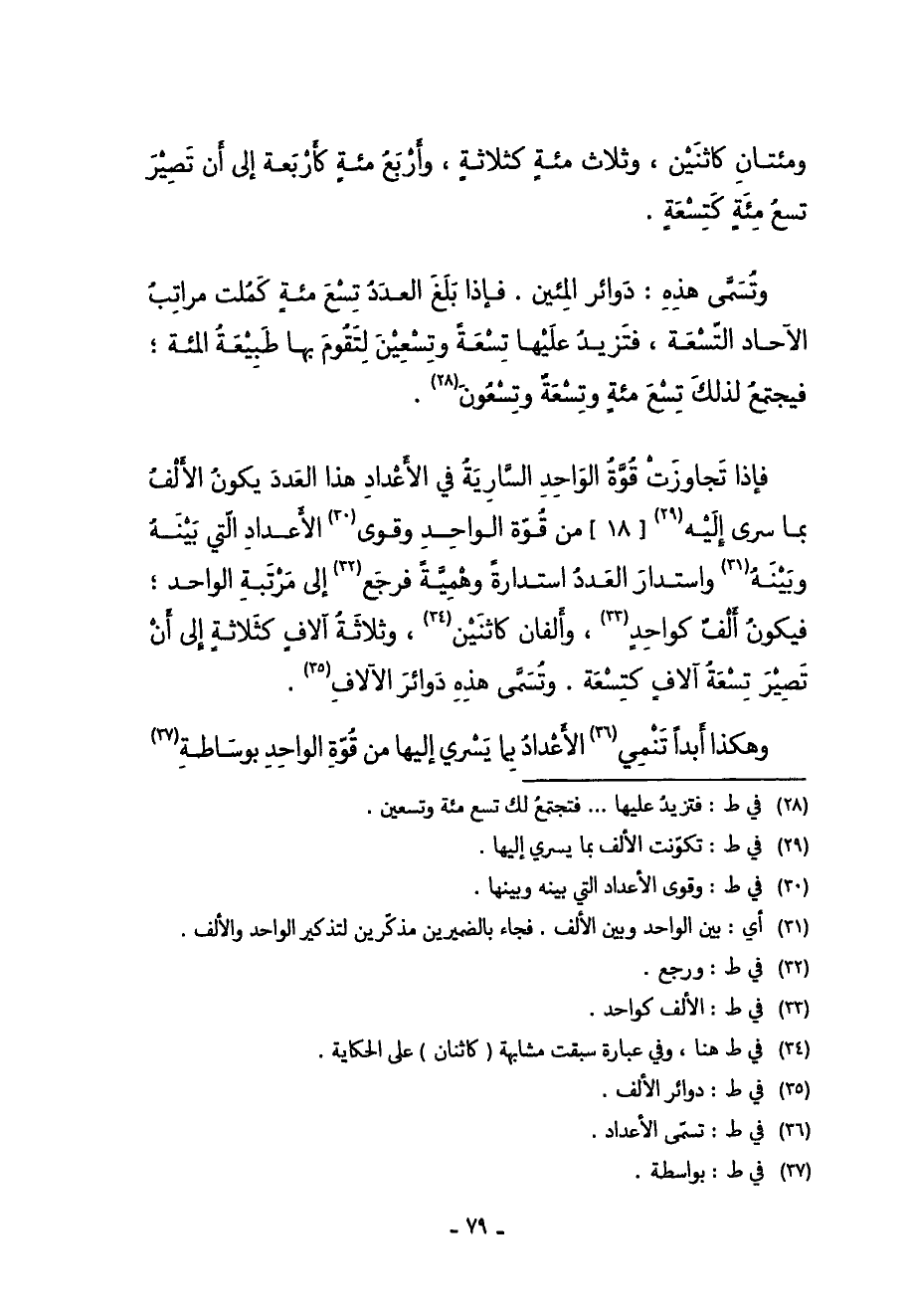 وَتسَمى هَذِه دوائر المئين فَإِذا بلغ الْعدَد تسع مئة كملت مَرَاتِب الْآحَاد التِّسْعَة فتزيد عَلَيْهَا تِسْعَة وَتِسْعين لتقوم بهَا طبيعة المئة فيجتمع لذَلِك تسع مئة وَتِسْعَة وَتسْعُونَ