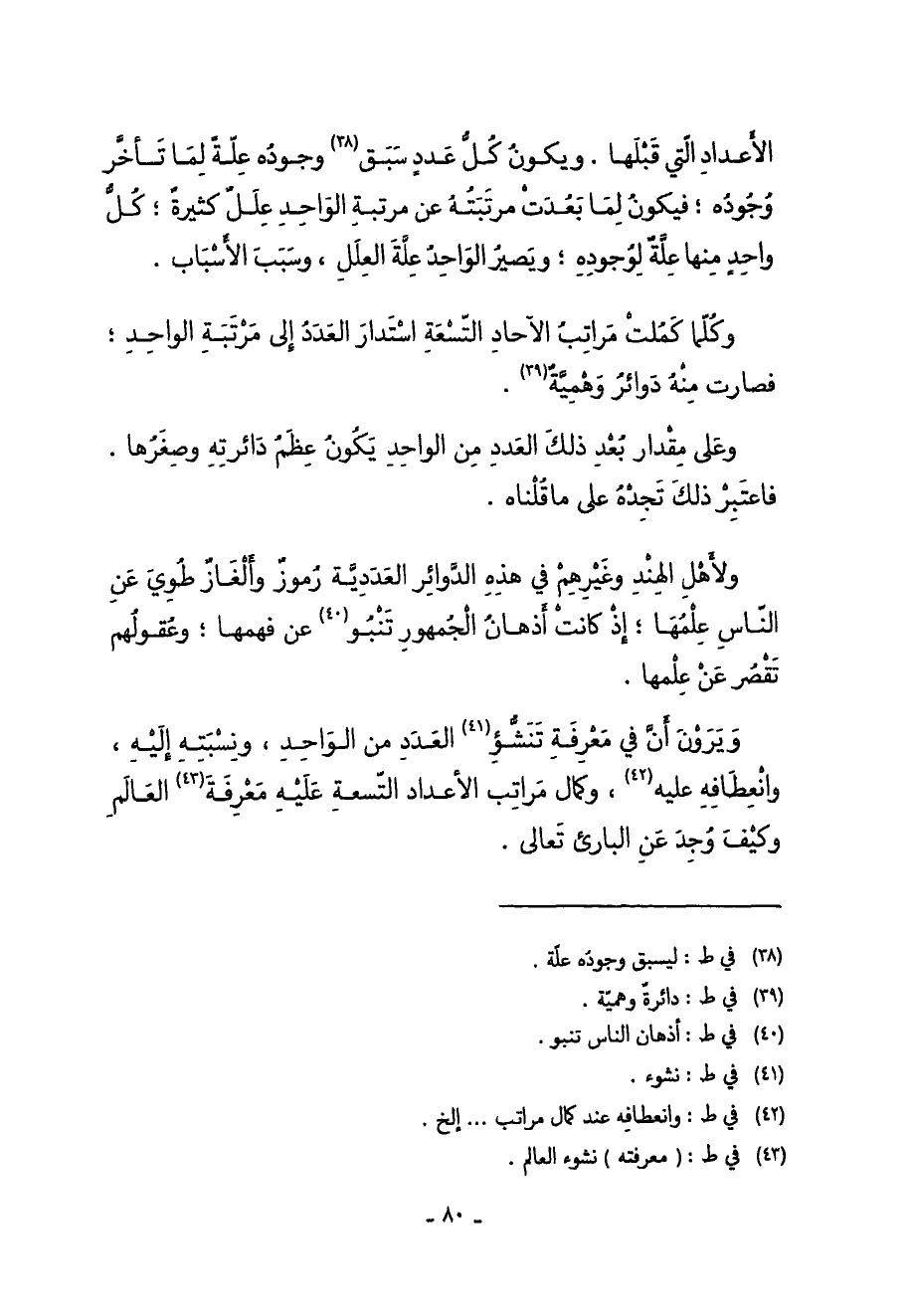 الْأَعْدَاد الَّتِي قبلهَا وَيكون كل عدد سبق وجوده عِلّة علية لما تَأَخّر وجوده فَيكون لما بَعدت مرتبته عَن مرتبَة الْوَاحِد علل كَثِيرَة كل وَاحِد مِنْهَا عِلّة لوُجُوده وَيصير الْوَاحِد عِلّة الْعِلَل وَسبب الْأَسْبَاب