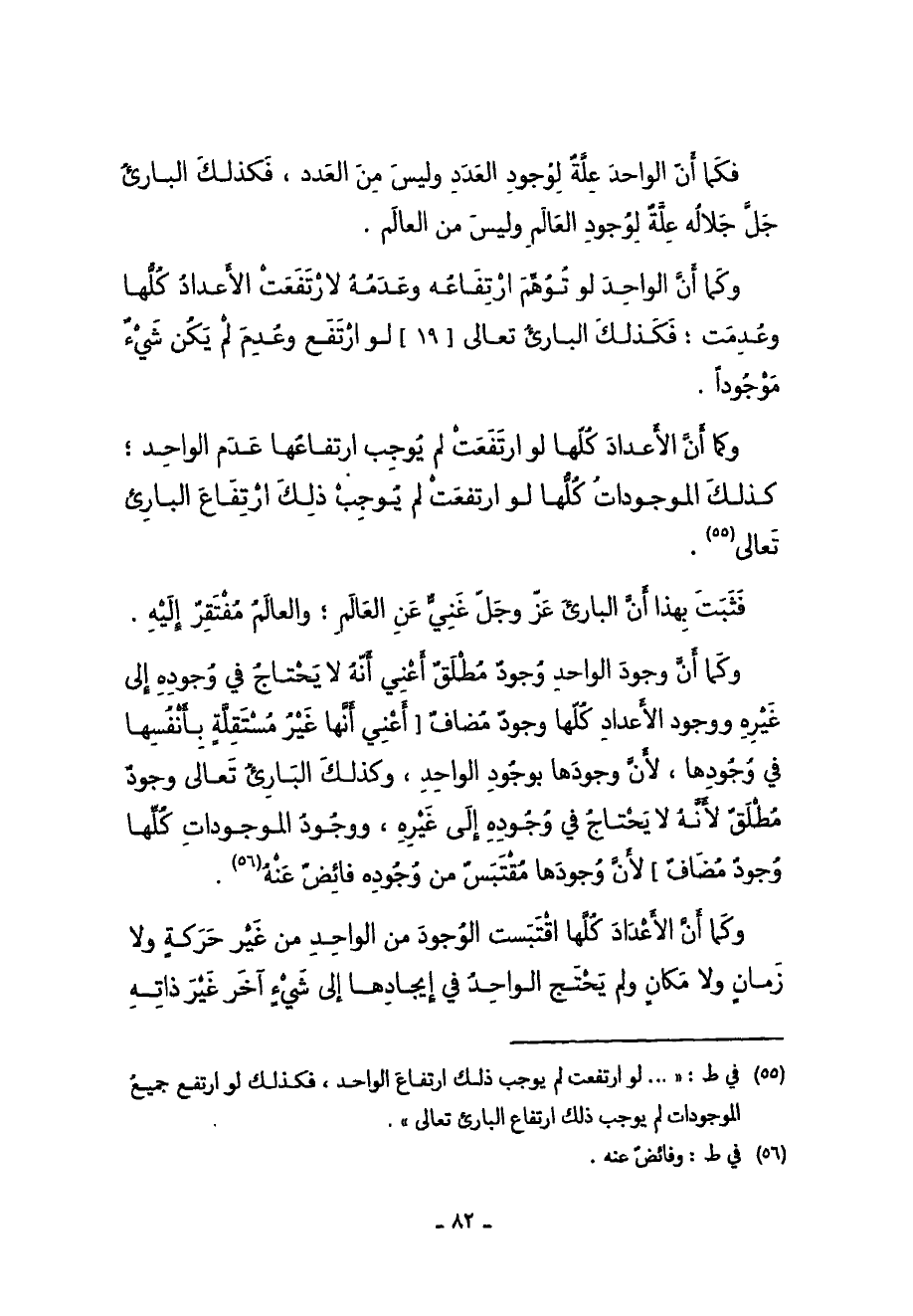 وكما أَن الْأَعْدَاد كلهَا لَو ارْتَفَعت لم يُوجب ارتفاعها عدم الْوَاحِد كَذَلِك الموجودات كلهَا لَو ارْتَفَعت لم يُوجب ذَلِك ارْتِفَاع البارئ تَعَالَى