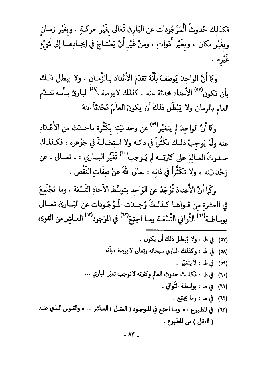 وكما أَن الْوَاحِد لم يتَغَيَّر عَن وحدانيته بِكَثْرَة مَا حدث من الْأَعْدَاد عَنهُ وَلم يُوجب ذَلِك تكثرا فِي ذَاته وَلَا اسْتِحَالَة فِي جوهره فَكَذَلِك حُدُوث الْعَالم على كثرته لم يُوجب تغير الْبَارِي تَعَالَى عَن وحدانيته وَلَا تكثرا فِي ذَاته تَعَالَى الله عَن صِفَات النَّقْص