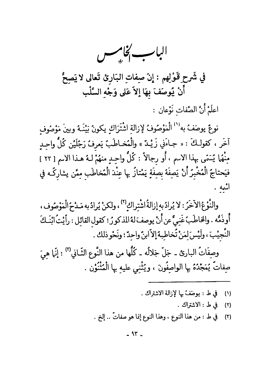 الْبَاب الْخَامِس فِي شرح قَوْلهم إِن صِفَات البارئ تَعَالَى لَا يَصح أَن يُوصف بهَا إِلَّا على وَجه السَّلب