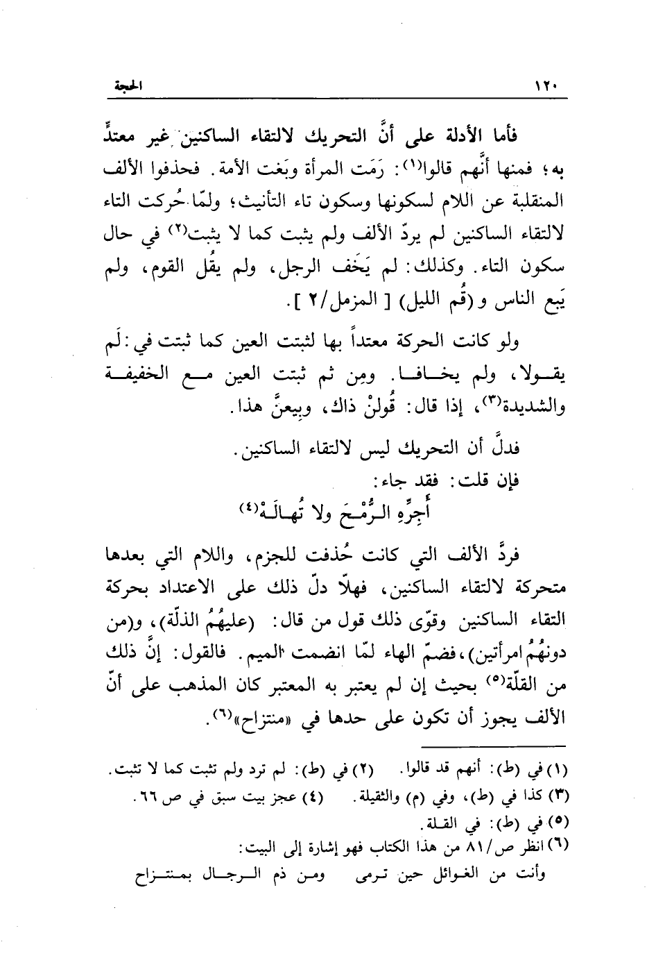 فأما الأدلة على أنّ التحريك لالتقاء الساكنين غير معتدّ به، فمنها أنّهم قالوا «1»: رمت المرأة وبغت الأمة. فحذفوا الألف المنقلبة عن اللام لسكونها وسكون تاء التأنيث، ولمّا حركت التاء لالتقاء الساكنين لم يردّ الألف ولم يثبت كما لا يثبت «2» في حال سكون التاء. وكذلك: لم يخف الرجل، ولم يقل القوم، ولم يبع الناس وقُمِ اللَّيْلَ [المزمل/ 2].