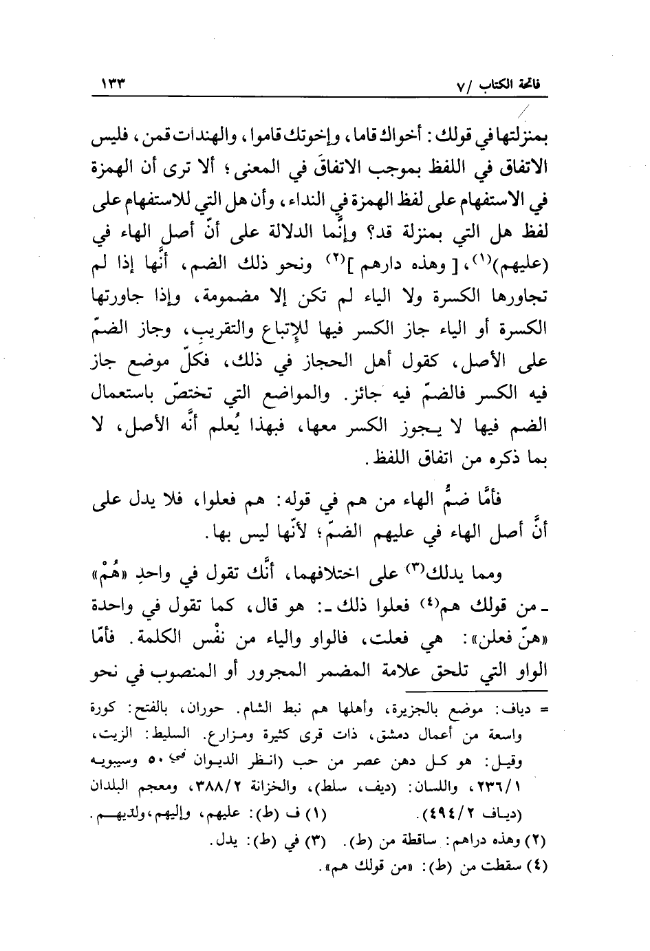 بمنزلتها في قولك: أخواك قاما، وإخوتك قاموا، والهندات قمن، فليس الاتفاق في اللفظ بموجب الاتفاق في المعنى، ألا ترى أن الهمزة في الاستفهام على لفظ الهمزة في النداء، وأن هل التي للاستفهام على لفظ هل التي بمنزلة قد؟ وإنّما الدلالة على أنّ أصل الهاء في (عليهم) «1»، [وهذه دارهم] «2» ونحو ذلك الضم، أنّها إذا لم تجاورها الكسرة ولا الياء لم تكن إلا مضمومة، وإذا جاورتها الكسرة أو الياء جاز الكسر فيها للإتباع والتقريب، وجاز الضمّ على الأصل، كقول أهل الحجاز في ذلك، فكلّ موضع جاز فيه الكسر فالضمّ فيه جائز. والمواضع التي تختصّ باستعمال الضم فيها لا يجوز الكسر معها، فبهذا يعلم أنّه الأصل، لا بما ذكره من اتفاق اللفظ.
