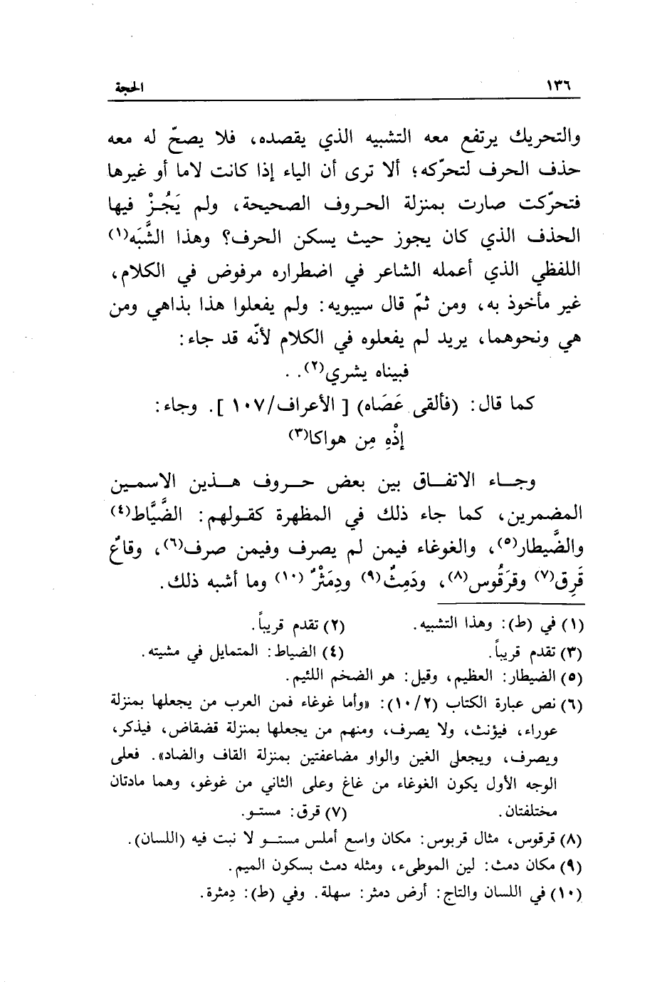 والتحريك يرتفع معه التشبيه الذي يقصده، فلا يصحّ له معه حذف الحرف لتحرّكه، ألا ترى أن الياء إذا كانت لاما أو غيرها فتحرّكت صارت بمنزلة الحروف الصحيحة، ولم يجز فيها الحذف الذي كان يجوز حيث يسكن الحرف؟ وهذا الشّبه «1» اللفظي الذي أعمله الشاعر في اضطراره مرفوض في الكلام، غير مأخوذ به، ومن ثمّ قال سيبويه: ولم يفعلوا هذا بذاهي ومن هي ونحوهما، يريد لم يفعلوه في الكلام لأنّه قد جاء: