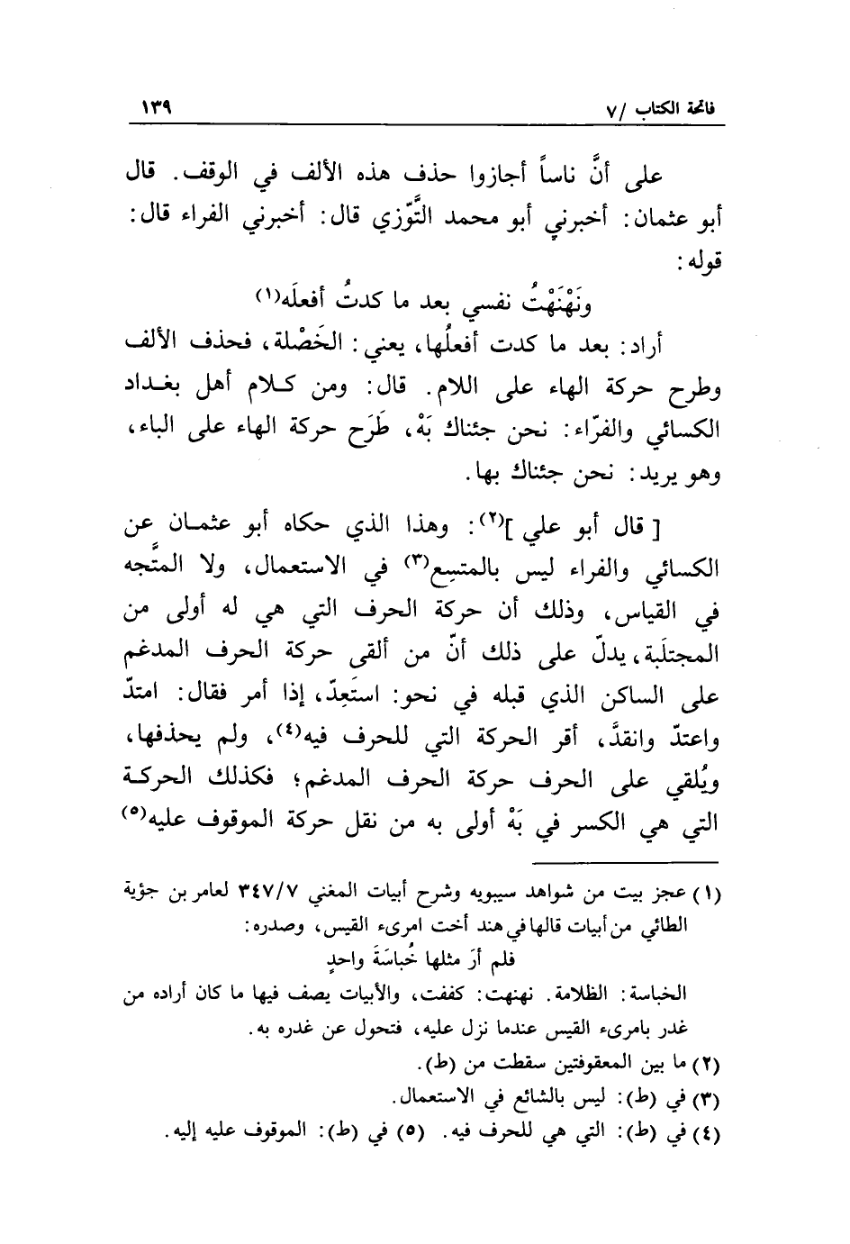 على أنّ ناسا أجازوا حذف هذه الألف في الوقف. قال أبو عثمان: أخبرني أبو محمد التّوّزي قال: أخبرني الفراء قال: