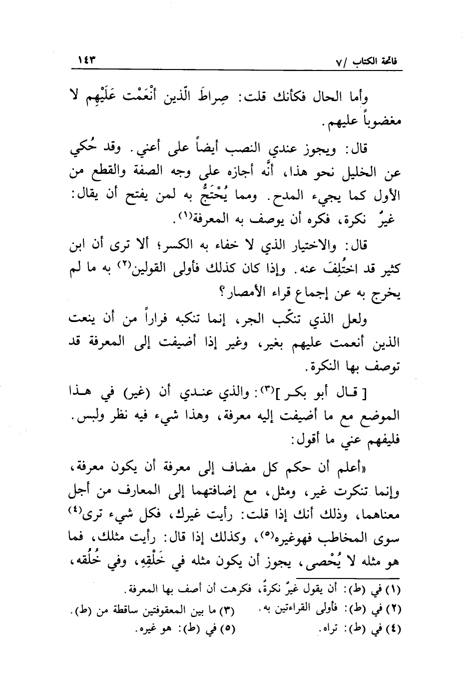 ولعل الذي تنكّب الجر، إنما تنكبه فرارا من أن ينعت الذين أنعمت عليهم بغير، وغير إذا أضيفت إلى المعرفة قد توصف بها النكرة.