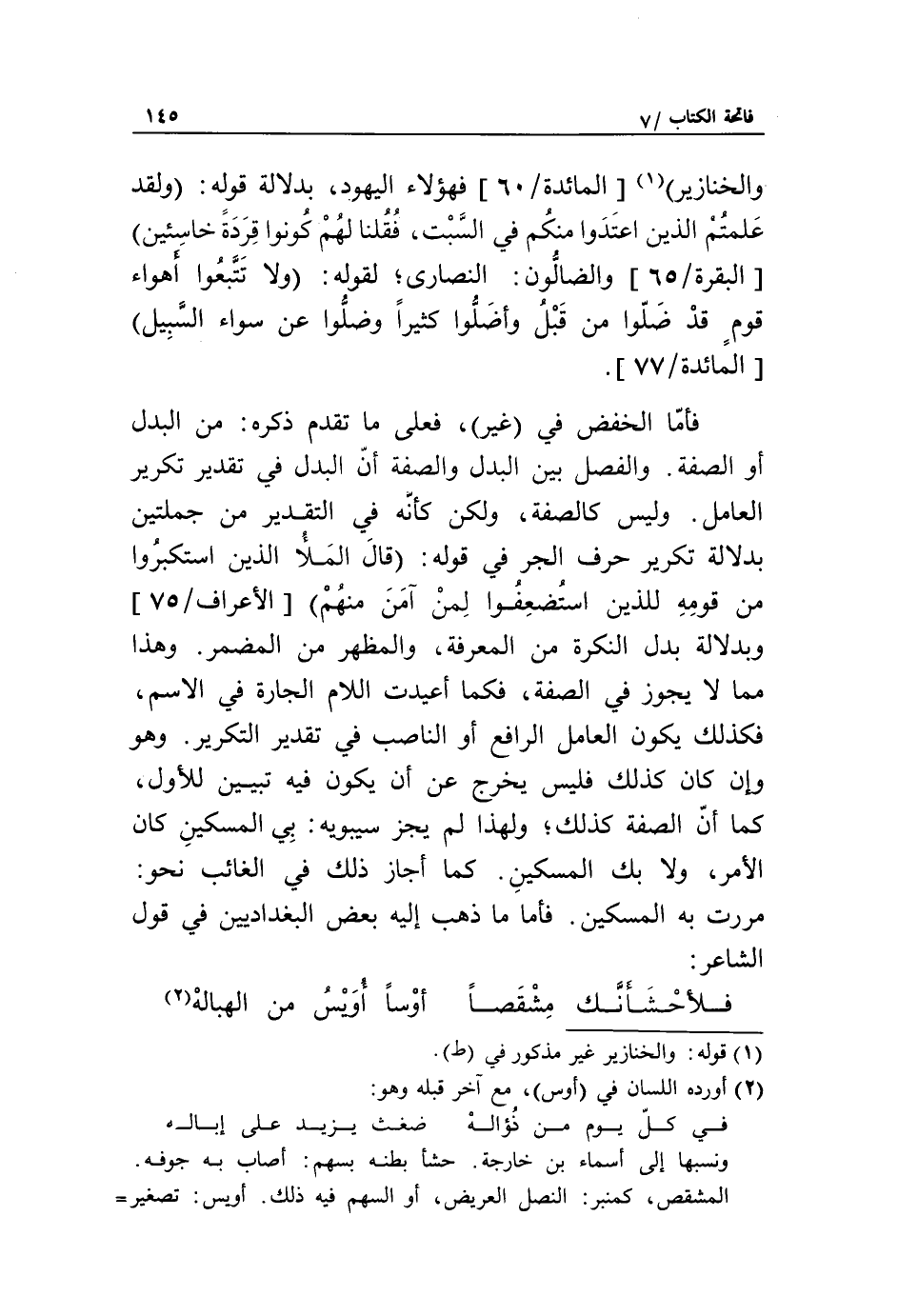 فأمّا الخفض في (غَيْرِ)، فعلى ما تقدم ذكره: من البدل أو الصفة. والفصل بين البدل والصفة أنّ البدل في تقدير تكرير العامل. وليس كالصفة، ولكن كأنّه في التقدير من جملتين بدلالة تكرير حرف الجر في قوله: قالَ الْمَلَأُ الَّذِينَ اسْتَكْبَرُوا مِنْ قَوْمِهِ لِلَّذِينَ اسْتُضْعِفُوا لِمَنْ آمَنَ مِنْهُمْ [الأعراف/ 75] وبدلالة بدل النكرة من المعرفة، والمظهر من المضمر. وهذا مما لا يجوز في الصفة، فكما أعيدت اللام الجارة في الاسم، فكذلك يكون العامل الرافع أو الناصب في تقدير التكرير. وهو وإن كان كذلك فليس يخرج عن أن يكون فيه تبيين للأول، كما أنّ الصفة كذلك، ولهذا لم يجز سيبويه: بي المسكين كان الأمر، ولا بك المسكين. كما أجاز ذلك في الغائب نحو: