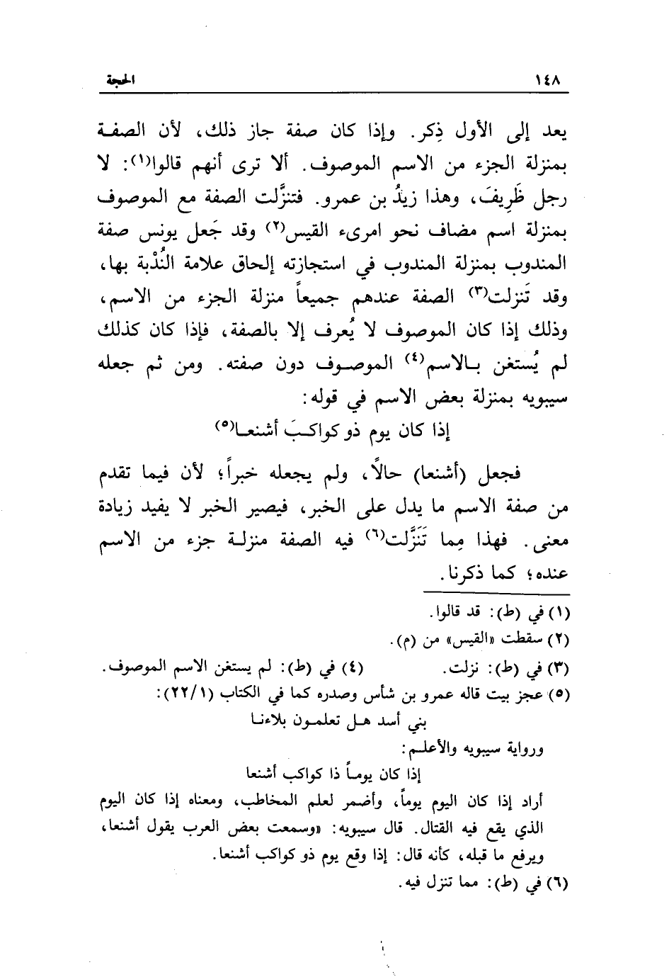 إذا كان يوم ذو كواكب أشنعا «5» فجعل (أشنعا) حالا، ولم يجعله خبرا، لأن فيما تقدم من صفة الاسم ما يدل على الخبر، فيصير الخبر لا يفيد زيادة معنى. فهذا مما تنزّلت «6» فيه الصفة منزلة جزء من الاسم عنده، كما ذكرنا.
