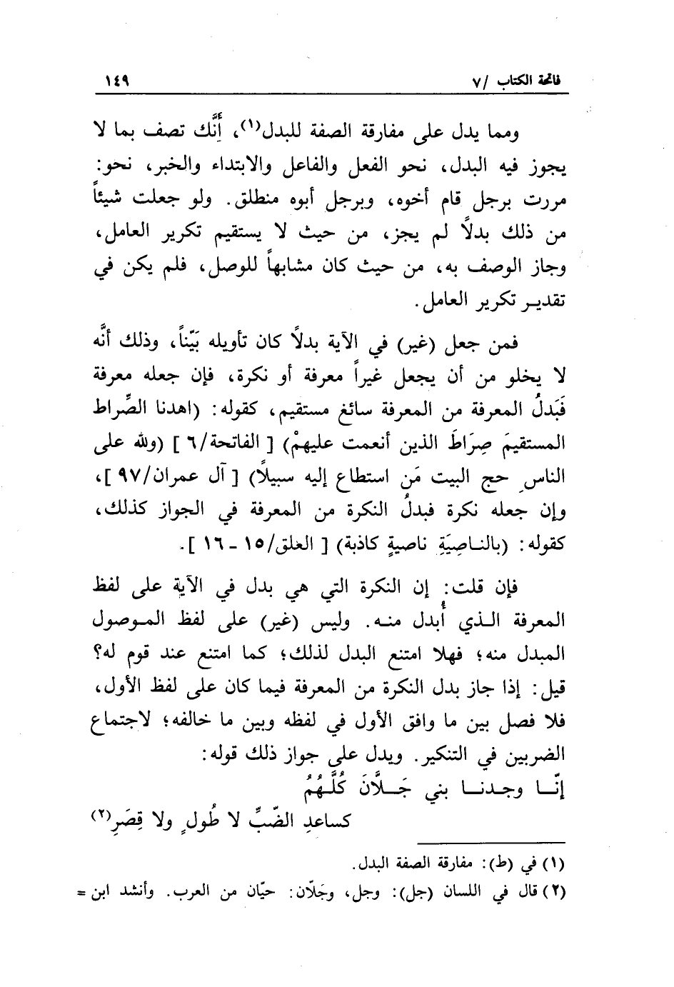 [الفاتحة/ 6] وَلِلَّهِ عَلَى النَّاسِ حِجُّ الْبَيْتِ مَنِ اسْتَطاعَ إِلَيْهِ سَبِيلًا [آل عمران/ 97]، وإن جعله نكرة فبدل النكرة من المعرفة في الجواز كذلك، كقوله: بِالنَّاصِيَةِ ناصِيَةٍ كاذِبَةٍ [العلق/ 15 - 16].