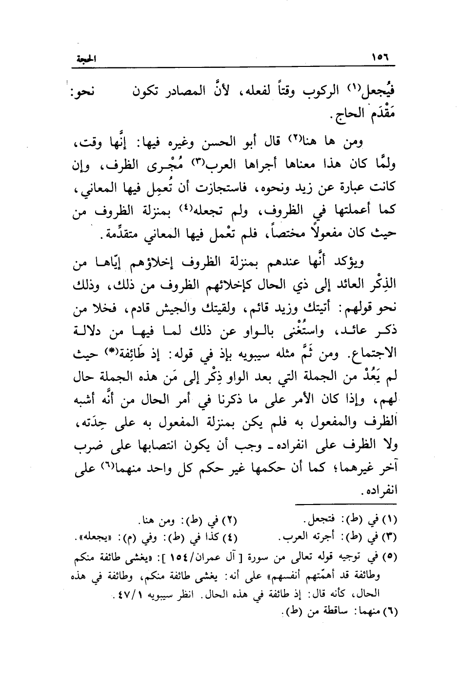 (5) في توجيه قوله تعالى من سورة [آل عمران/ 154]: «يَغْشى طائِفَةً مِنْكُمْ وَطائِفَةٌ قَدْ أَهَمَّتْهُمْ أَنْفُسُهُمْ» على أنه: يغشى طائفة منكم، وطائفة في هذه الحال، كأنه قال: إذ طائفة في هذه الحال. انظر سيبويه 1/ 47.