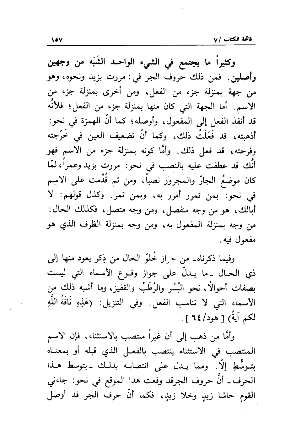 وكثيرا ما يجتمع في الشيء الواحد الشبه من وجهين وأصلين. فمن ذلك حروف الجر في: مررت بزيد ونحوه، وهو من جهة بمنزلة جزء من الفعل، ومن أخرى بمنزلة جزء من الاسم. أما الجهة التي كان منها بمنزلة جزء من الفعل، فلأنّه قد أنفذ الفعل إلى المفعول، وأوصله، كما أنّ الهمزة في نحو: