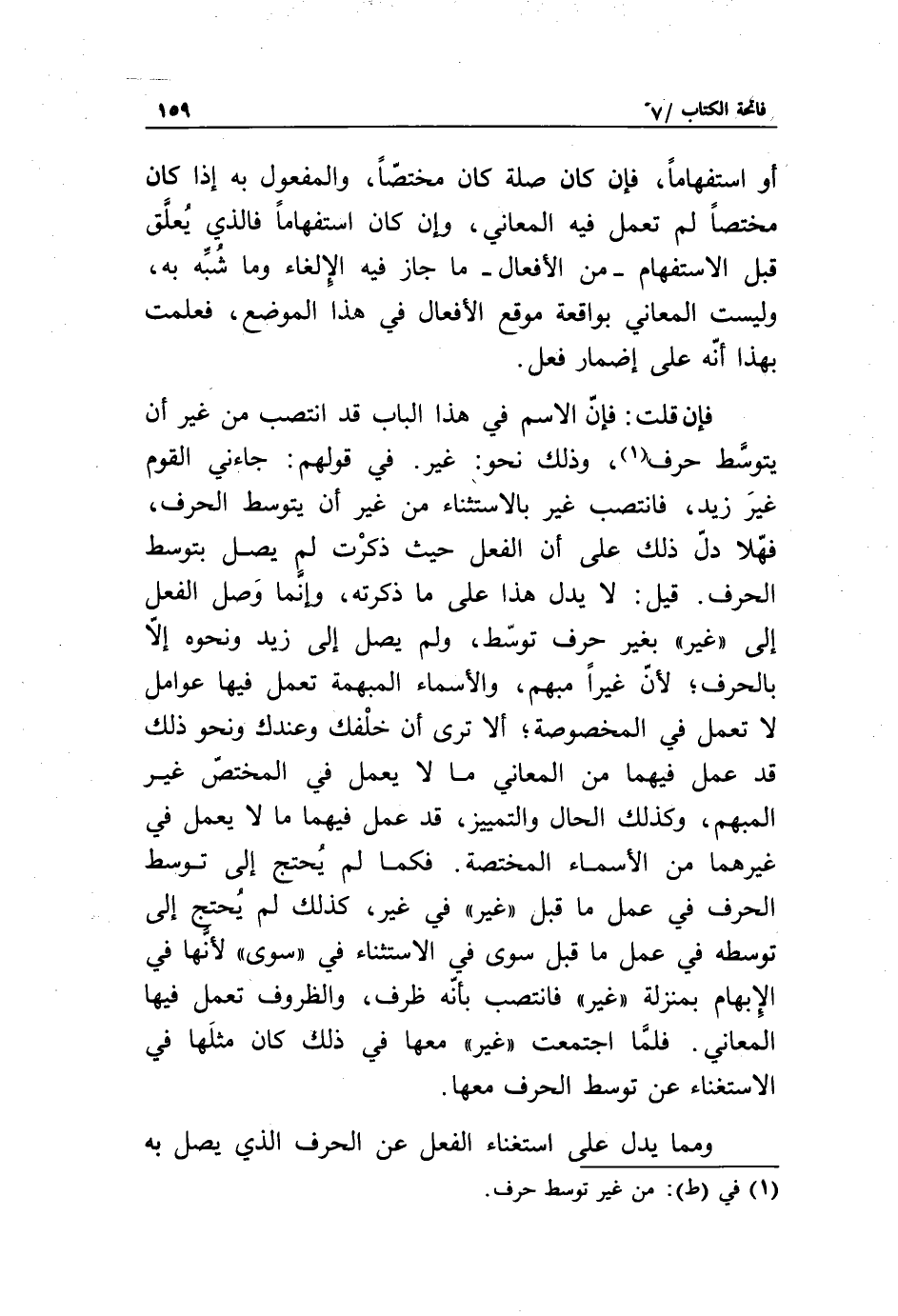فإن قلت: فإنّ الاسم في هذا الباب قد انتصب من غير أن يتوسّط حرف «1»، وذلك نحو: غير. في قولهم: جاءني القوم غير زيد، فانتصب غير بالاستثناء من غير أن يتوسط الحرف، فهلّا دلّ ذلك على أن الفعل حيث ذكرت لم يصل بتوسط الحرف. قيل: لا يدل هذا على ما ذكرته، وإنّما وصل الفعل إلى «غير» بغير حرف توسّط، ولم يصل إلى زيد ونحوه إلّا بالحرف، لأنّ غيرا مبهم، والأسماء المبهمة تعمل فيها عوامل لا تعمل في المخصوصة، ألا ترى أن خلفك وعندك ونحو ذلك قد عمل فيهما من المعاني ما لا يعمل في المختصّ غير المبهم، وكذلك الحال والتمييز، قد عمل فيهما ما لا يعمل في غيرهما من الأسماء المختصة. فكما لم يحتج إلى توسط الحرف في عمل ما قبل «غير» في غير، كذلك لم يحتج إلى توسطه في عمل ما قبل سوى في الاستثناء في «سوى» لأنّها في الإبهام بمنزلة «غير» فانتصب بأنّه ظرف، والظروف تعمل فيها المعاني. فلمّا اجتمعت «غير» معها في ذلك كان مثلها في الاستغناء عن توسط الحرف معها.
