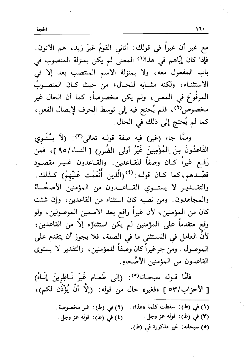 وممّا جاء (غَيْرِ) فيه صفة قوله تعالى «3»: لا يَسْتَوِي الْقاعِدُونَ مِنَ الْمُؤْمِنِينَ غَيْرُ أُولِي الضَّرَرِ [النساء/ 95]، فمن رفع غيرا كان وصفا للقاعدين. والقاعدون غير مقصود قصدهم، كما كان قوله: «4» الَّذِينَ أَنْعَمْتَ عَلَيْهِمْ كذلك.