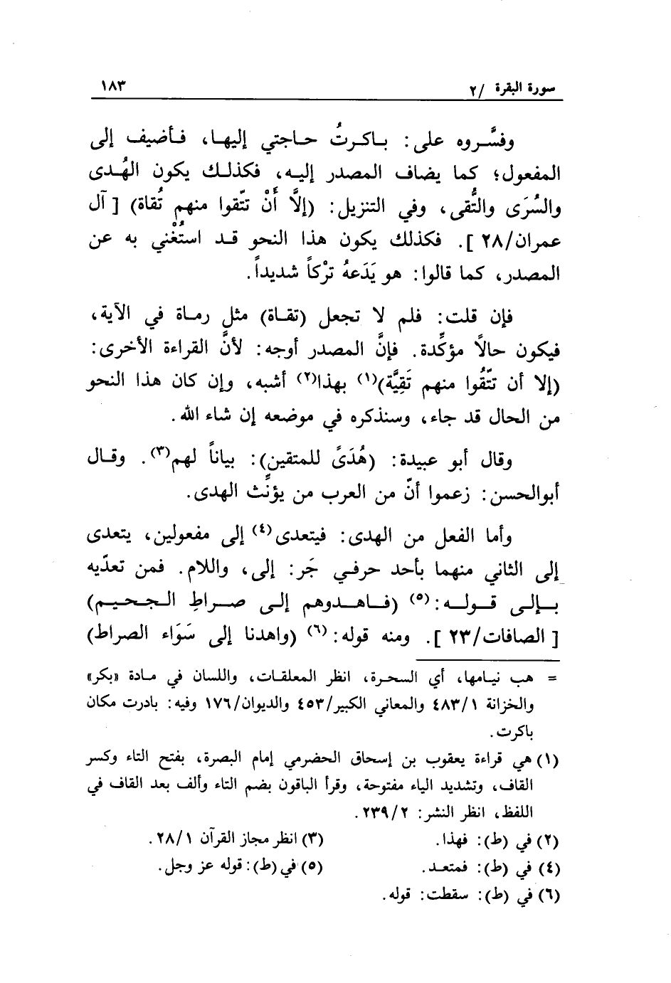 وأما الفعل من الهدى: فيتعدى «4» إلى مفعولين، يتعدى إلى الثاني منهما بأحد حرفي جر: إلى، واللام. فمن تعدّيه بإلى قوله: «5» فَاهْدُوهُمْ إِلى صِراطِ الْجَحِيمِ [الصافات/ 23]. ومنه قوله: «6» وَاهْدِنا إِلى سَواءِ الصِّراطِ