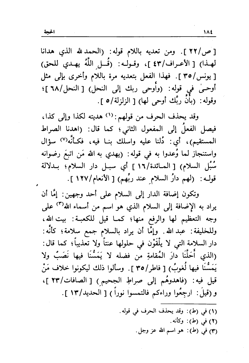 وقد يحذف الحرف من قولهم: «1» هديته لكذا وإلى كذا، فيصل الفعل إلى المفعول الثاني، كما قال: اهْدِنَا الصِّراطَ الْمُسْتَقِيمَ، أي: دلنا عليه واسلك بنا فيه، فكأنّه «2» سؤال واستنجاز لما وعدوا به في قوله: يَهْدِي بِهِ اللَّهُ مَنِ اتَّبَعَ رِضْوانَهُ سُبُلَ السَّلامِ [المائدة/ 16] أي سبل دار السلام، بدلالة قوله: لَهُمْ دارُ السَّلامِ عِنْدَ رَبِّهِمْ [الأنعام/ 127].