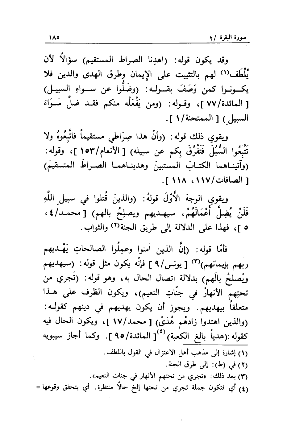 ويقوي الوجه الأوّل قوله: وَالَّذِينَ قُتِلُوا فِي سَبِيلِ اللَّهِ فَلَنْ يُضِلَّ أَعْمالَهُمْ، سَيَهْدِيهِمْ وَيُصْلِحُ بالَهُمْ [محمد/ 4، 5]، فهذا على الدلالة إلى طريق الجنة «2» والثواب.