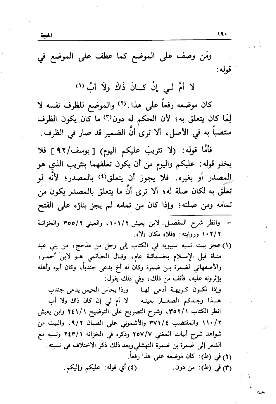 (1) عجز بيت نسبه سيبويه في الكتاب إلى رجل من مذحج، من بني عبد مناة قبل الإسلام بخمسمائة عام، وقال الحاتمي هو لابن أحمر، والأصفهاني لضمرة بن ضمرة وكان له أخ يدعى جندبا، وكان أبوه وأهله يؤثرونه عليه، فأنف من ذلك، وفي ذلك يقول:
