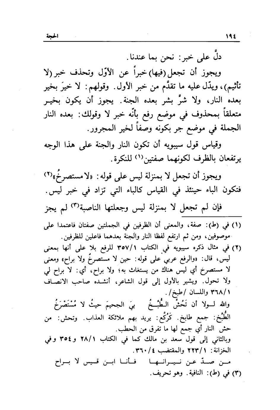 (2) في مثال ذكره سيبويه في الكتاب 1/ 357 للرفع بلا على أنها بمعنى ليس، قال: «والرفع عربي على قوله: حين لا مستصرخ ولا براح» ومعنى لا مستصرخ أي ليس هناك من يستغاث به، ولا براح، أي: لا براح لي ولا تحول. ويشير بالأول إلى قول الشاعر، أنشده صاحب الانصاف 1/ 368 واللسان/ طبخ/.