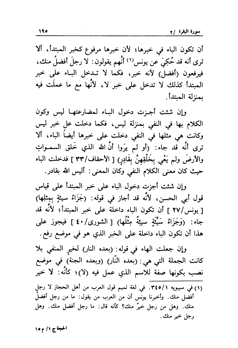 وإن شئت أجزت دخول الباء لمضارعتها ليس وكون الكلام بها في النفي بمنزلة ليس، فكما دخلت على خبر ليس وكانت هي مثلها في النفي دخلت على خبرها أيضا الباء، ألا ترى أنّه قد جاء: أَوَلَمْ يَرَوْا أَنَّ اللَّهَ الَّذِي خَلَقَ السَّماواتِ وَالْأَرْضَ وَلَمْ يَعْيَ بِخَلْقِهِنَّ بِقادِرٍ [الأحقاف/ 33] فدخلت الباء حيث كان معنى الكلام النفي وكان المعنى: أليس الله بقادر.