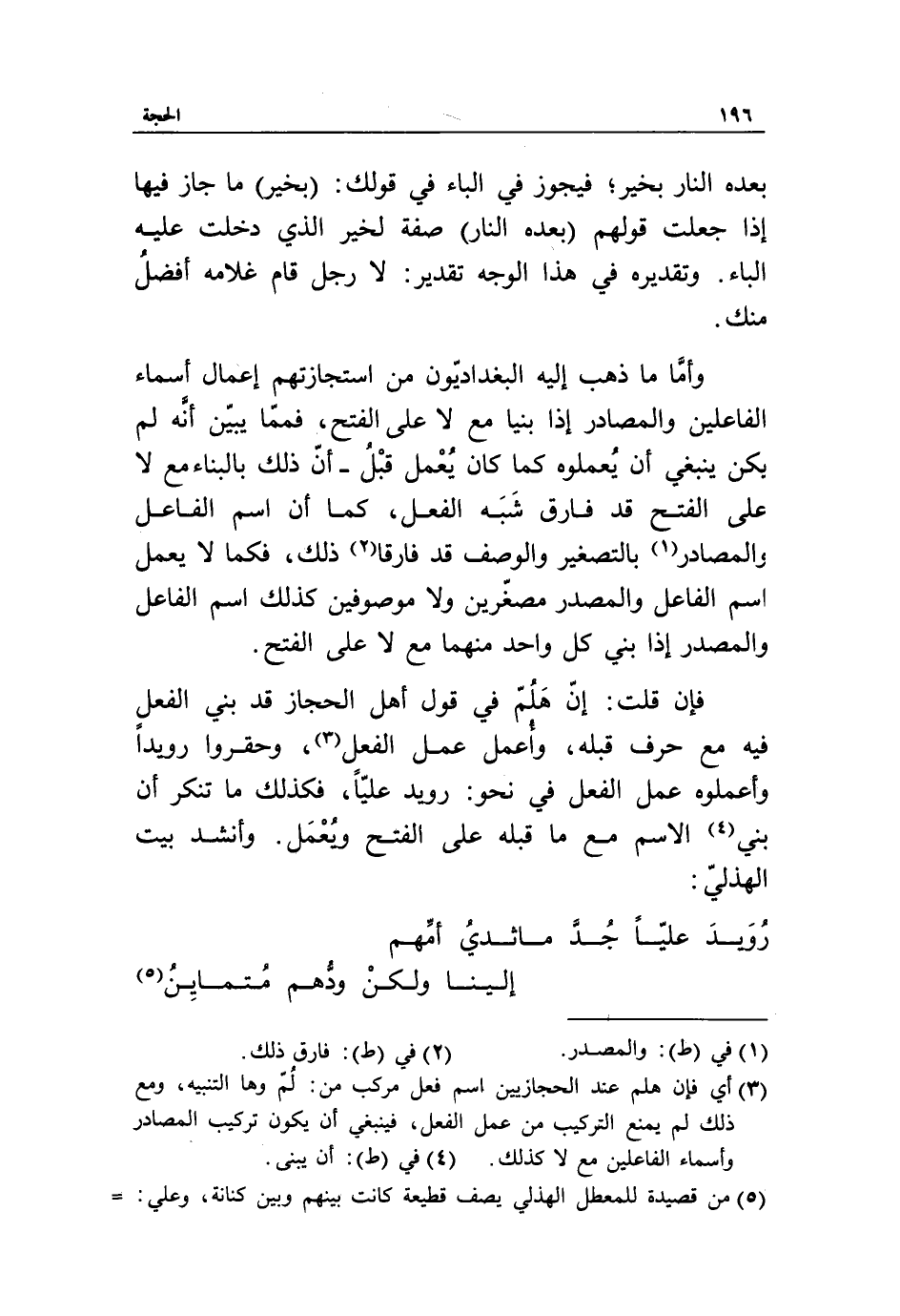 فإن قلت: إنّ هلمّ في قول أهل الحجاز قد بني الفعل فيه مع حرف قبله، وأعمل عمل الفعل «3»، وحقروا رويدا وأعملوه عمل الفعل في نحو: رويد عليّا، فكذلك ما تنكر أن بني «4» الاسم مع ما قبله على الفتح ويعمل. وأنشد بيت الهذليّ: