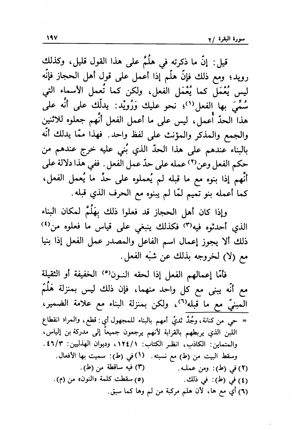 فأمّا إعمالهم الفعل إذا لحقه النون «5» الخفيفة أو الثقيلة مع أنّه يبنى مع كل واحد منهما، فإن ذلك ليس بمنزلة هلمّ المبنيّ مع ما قبله «6»، ولكن بمنزلة البناء مع علامة الضمير،