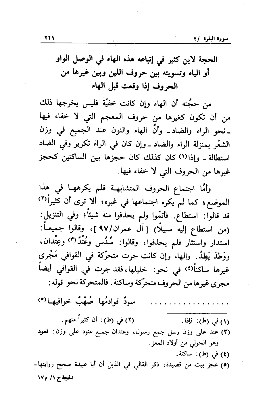 استدار واستثار فلم يحذفوا، وقالوا: سدس وعتد «3» وعتدان، ووطد يطد. والهاء وإن كانت جرت متحرّكة في القوافي مجرى غيرها ساكنا «4» في نحو: خليلها، فقد جرت في القوافي أيضا مجرى غيرها من الحروف متحرّكة وساكنة. فالمتحركة نحو قوله:
