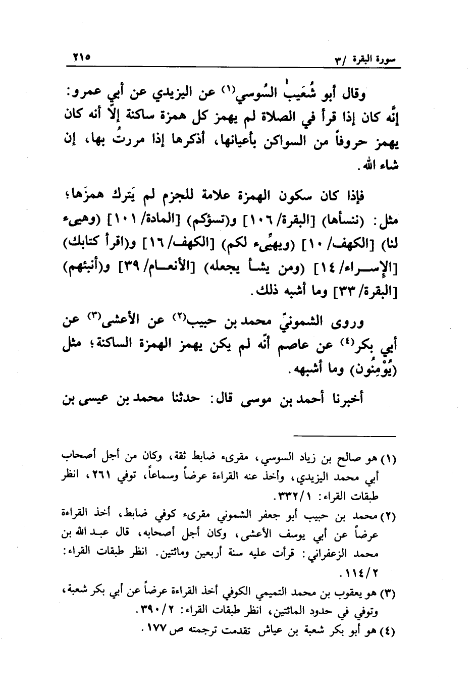 (2) محمد بن حبيب أبو جعفر الشموني مقرئ كوفي ضابط، أخذ القراءة عرضا عن أبي يوسف الأعشى، وكان أجل أصحابه، قال عبد الله بن محمد الزعفراني: قرأت عليه سنة أربعين ومائتين. انظر طبقات القراء: