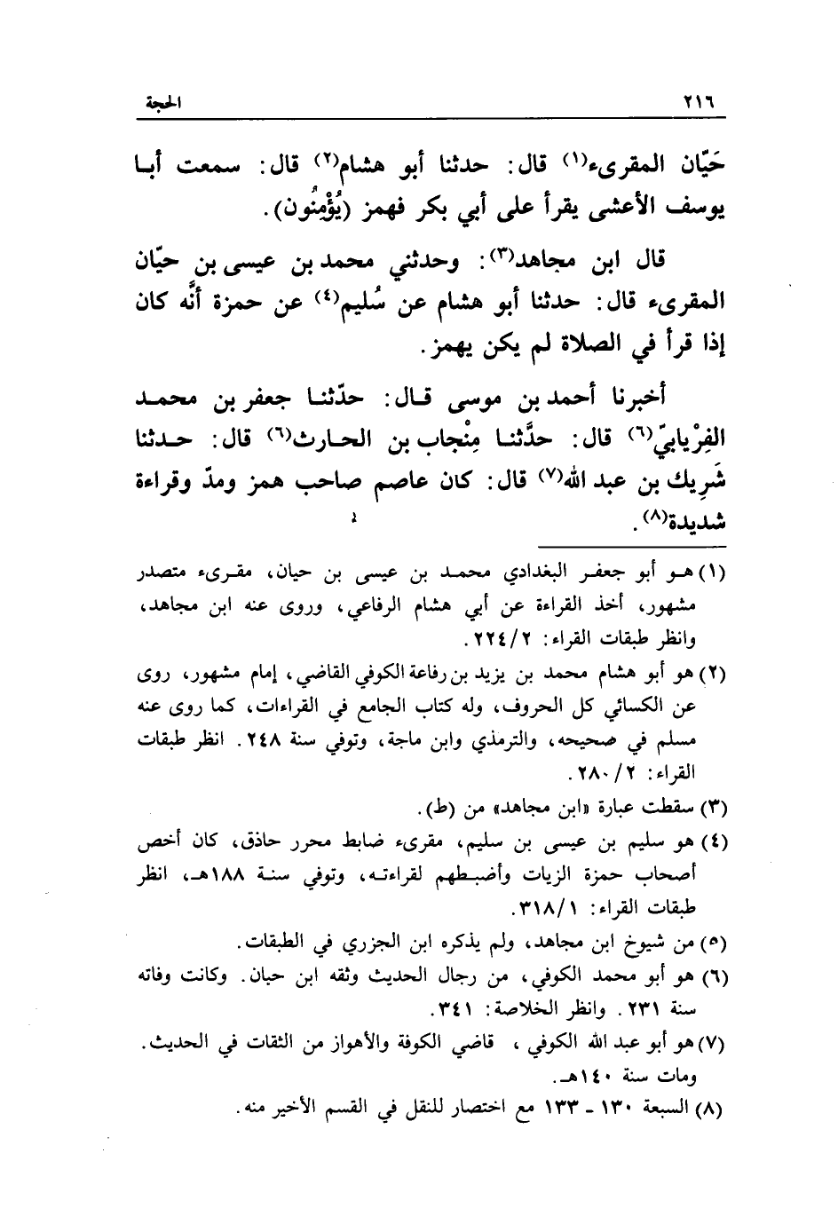 (1) هو أبو جعفر البغدادي محمد بن عيسى بن حيان، مقرئ متصدر مشهور، أخذ القراءة عن أبي هشام الرفاعي، وروى عنه ابن مجاهد، وانظر طبقات القراء: 2/ 224.