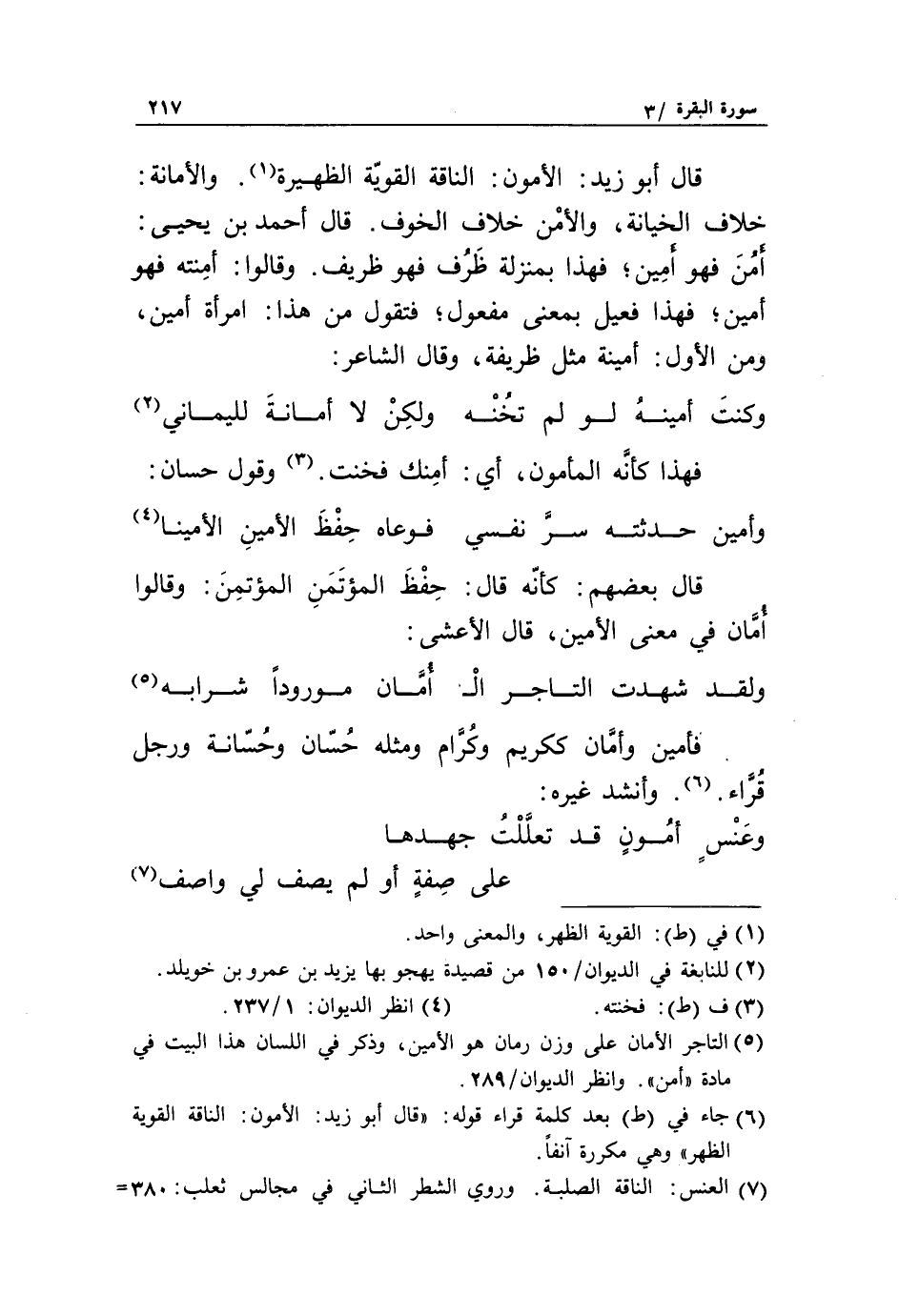 «4» قال بعضهم: كأنّه قال: حفظ المؤتمن المؤتمن: وقالوا أمّان في معنى الأمين، قال الأعشى: