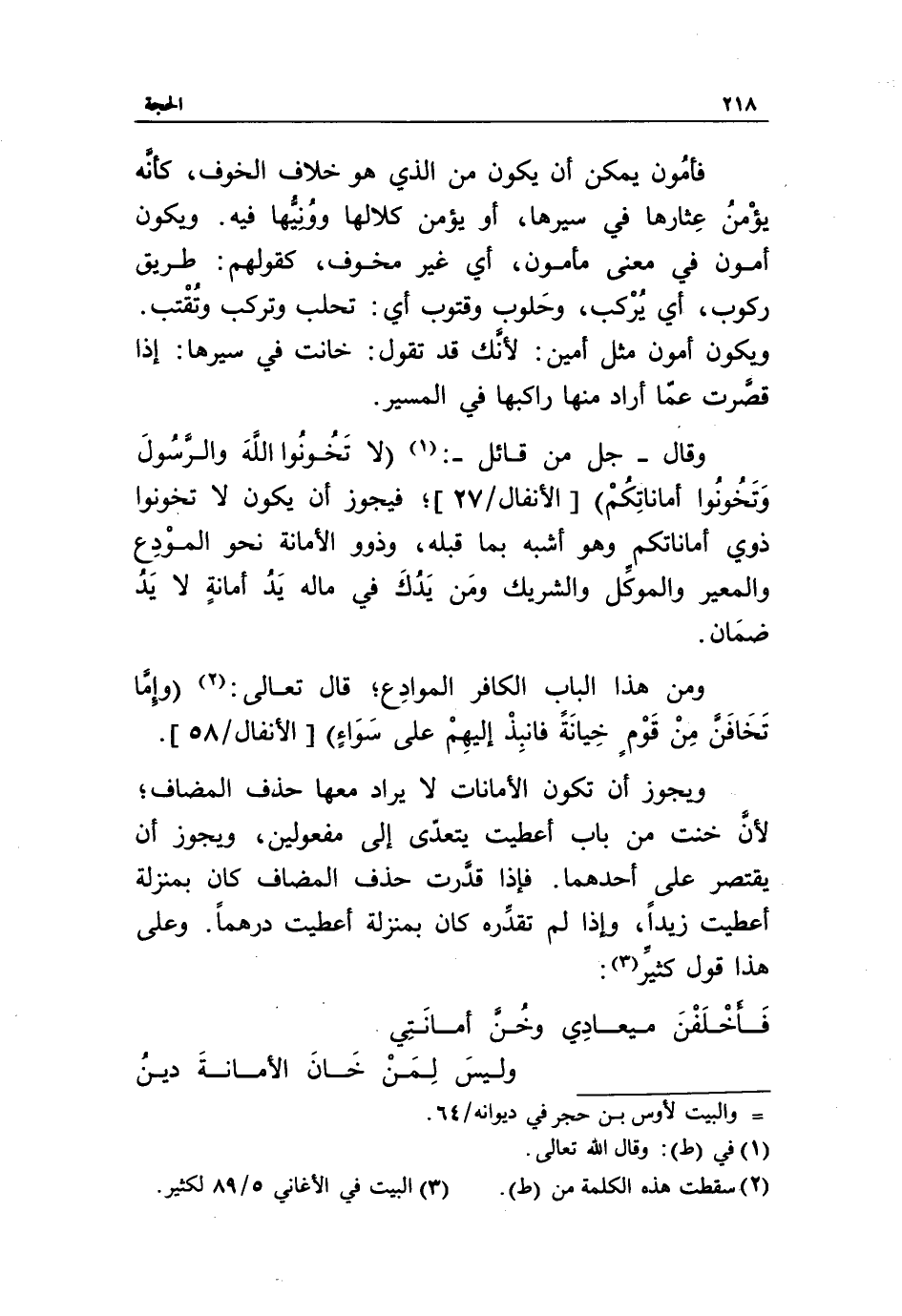 ويجوز أن تكون الأمانات لا يراد معها حذف المضاف، لأنّ خنت من باب أعطيت يتعدّى إلى مفعولين، ويجوز أن يقتصر على أحدهما. فإذا قدّرت حذف المضاف كان بمنزلة أعطيت زيدا، وإذا لم تقدّره كان بمنزلة أعطيت درهما. وعلى هذا قول كثير «3»: