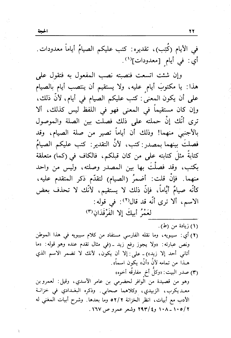 وإن شئت اتسعت فنصبته نصب المفعول به فتقول على هذا: يا مكتوب أيام عليه، ولا يستقيم أن ينتصب أيام بالصيام على أن يكون المعنى: كتب عليكم الصيام في أيام، لأنّ ذلك، وإن كان مستقيما في المعنى فهو في اللفظ ليس كذلك، ألا ترى أنّك إن حملته على ذلك فصلت بين الصلة والموصول بالأجنبي منهما! وذلك أن أياما تصير من صلة الصيام، وقد فصلت بينهما بمصدر: كتب، لأنّ التقدير: كتب عليكم الصيام كتابة مثل كتابته على من كان قبلكم، فالكاف في (كما) متعلقة بكتب، وقد فصلت بها بين المصدر وصلته، وليس من واحد منهما. فإن قلت: أضمر (الصِّيامُ) لتقدّم ذكر المتقدم عليه، كأنّه صيام أيّاما، فإنّ ذلك لا يستقيم، لأنّك لا تحذف بعض الاسم، ألا ترى أنّه قد قال «2»: في قوله: