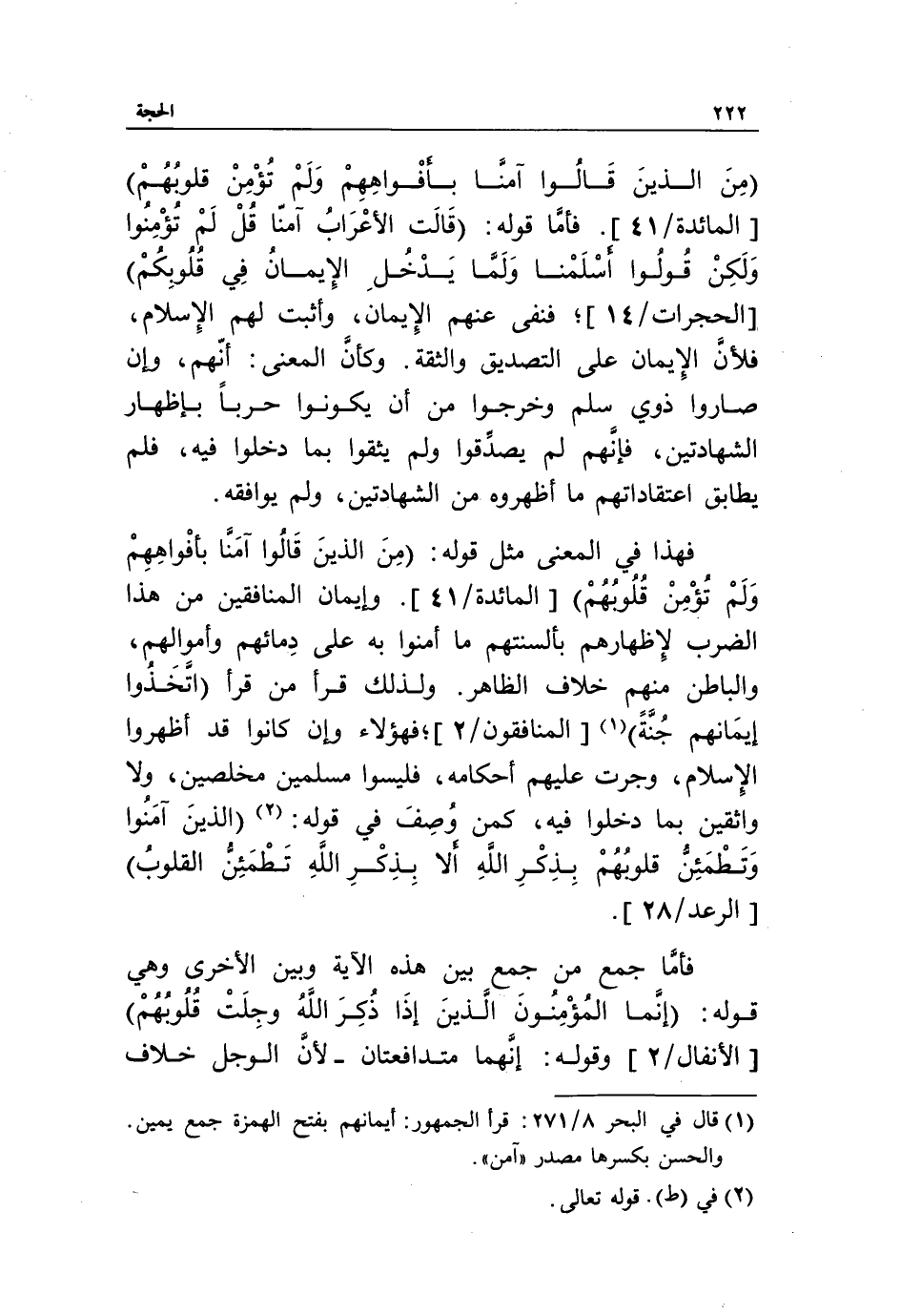 مِنَ الَّذِينَ قالُوا آمَنَّا بِأَفْواهِهِمْ وَلَمْ تُؤْمِنْ قُلُوبُهُمْ [المائدة/ 41]. فأمّا قوله: قالَتِ الْأَعْرابُ آمَنَّا قُلْ لَمْ تُؤْمِنُوا وَلكِنْ قُولُوا أَسْلَمْنا وَلَمَّا يَدْخُلِ الْإِيمانُ فِي قُلُوبِكُمْ [الحجرات/ 14]، فنفى عنهم الإيمان، وأثبت لهم الإسلام، فلأنّ الإيمان على التصديق والثقة. وكأنّ المعنى: أنّهم، وإن صاروا ذوي سلم وخرجوا من أن يكونوا حربا بإظهار الشهادتين، فإنّهم لم يصدّقوا ولم يثقوا بما دخلوا فيه، فلم يطابق اعتقاداتهم ما أظهروه من الشهادتين، ولم يوافقه.