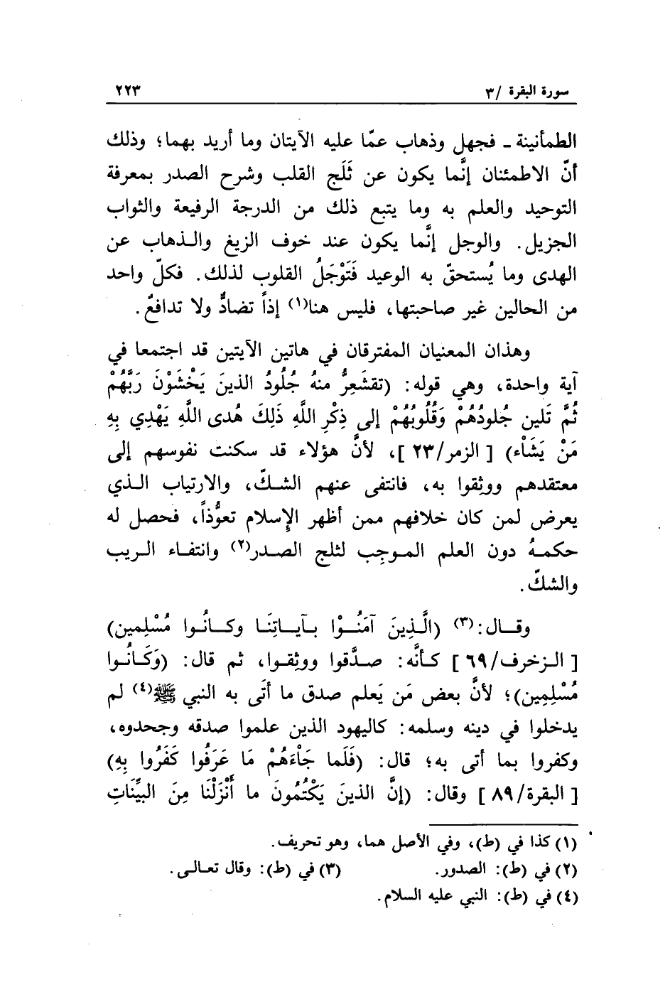 وهذان المعنيان المفترقان في هاتين الآيتين قد اجتمعا في آية واحدة، وهي قوله: تَقْشَعِرُّ مِنْهُ جُلُودُ الَّذِينَ يَخْشَوْنَ رَبَّهُمْ ثُمَّ تَلِينُ جُلُودُهُمْ وَقُلُوبُهُمْ إِلى ذِكْرِ اللَّهِ ذلِكَ هُدَى اللَّهِ يَهْدِي بِهِ مَنْ يَشاءُ [الزمر/ 23]، لأنّ هؤلاء قد سكنت نفوسهم إلى معتقدهم ووثقوا به، فانتفى عنهم الشكّ، والارتياب الذي يعرض لمن كان خلافهم ممن أظهر الإسلام تعوّذا، فحصل له حكمه دون العلم الموجب لثلج الصدر «2» وانتفاء الريب والشكّ.