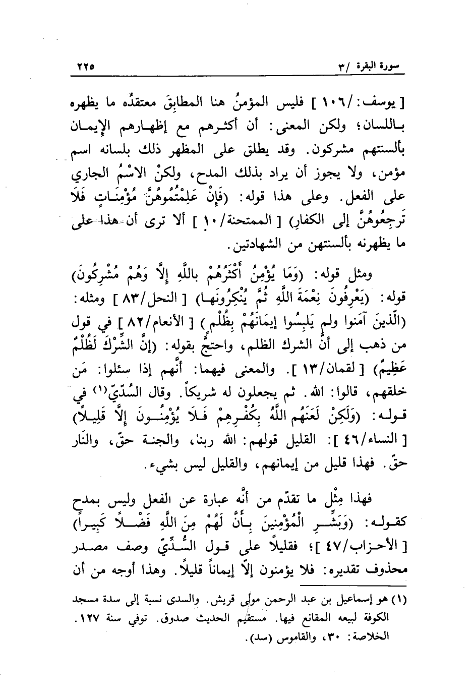 (1) هو إسماعيل بن عبد الرحمن مولى قريش. والسدى نسبة إلى سدة مسجد الكوفة لبيعه المقانع فيها. مستقيم الحديث صدوق. توفي سنة 127.