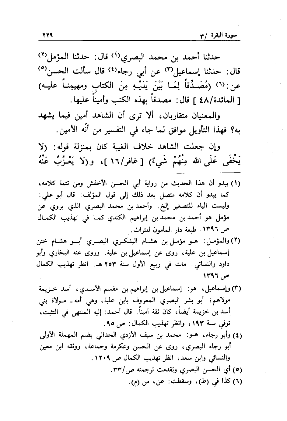حدثنا أحمد بن محمد البصري «1» قال: حدثنا المؤمل «2» قال: حدثنا إسماعيل «3» عن أبي رجاء «4» قال سألت الحسن «5» عن: «6» مُصَدِّقاً لِما بَيْنَ يَدَيْهِ مِنَ الْكِتابِ وَمُهَيْمِناً عَلَيْهِ [المائدة/ 48] قال: مصدقا بهذه الكتب وأمينا عليها.